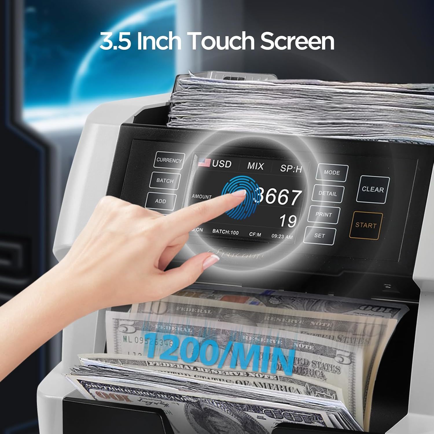 [Multi-Currency Functionality] - Designed to accommodate a mix of bills from different nations, this versatile machine recognizes USD, EURO, CAD, and MXN while offering popular functions such as mixed denomination counting(Mix), auto recognition currency or denomination(Auto), single denomination counting(Sort), Multi-currency mixed counting(Multi), Batch, Accumulation, and piece counting. [Advanced Counterfeit Detection] - Protect your business with the latest counterfeit detection technology featuring UV/MG/IR/CIS/Safety thread/ Infrared/RGB/Size detection. Our experts have traveled to the US collecting real and fake currency data, ensuring reliable detection of all US dollar versions in circulation. [Lightning Fast Counting] - With the Advanced NUCOUN VC-3 Money Counting Machine, count up to 1200 bills per minute with precision and accuracy. Outperforming other models with ease, this bill counter is built to meet your business demands. [Smart Data Analysis] - Achieve effective authentication with our banknote database storage feature, which inspect and scan the whole page to memory for data analysis. Easily connect to NUCOUN's POS printer or save counting data to your computer using our PC software.