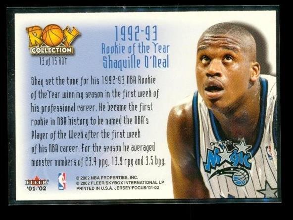2001-02 Fleer Focus Jersey Edition ROY Collection Shaquille O'Neal #13 ROY HOF