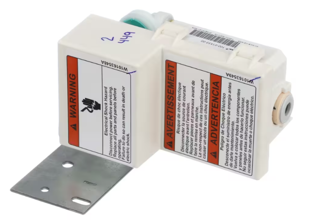 The Whirlpool 100-01533-00 Water Inlet Valve is a direct OEM replacement part that controls the flow of water to your refrigerator's ice maker. Engineered for reliability, this valve ensures optimal water supply for consistent ice production and is built to meet original performance standards. Ideal for replacing leaking, clogged, or non-functioning inlet valves.