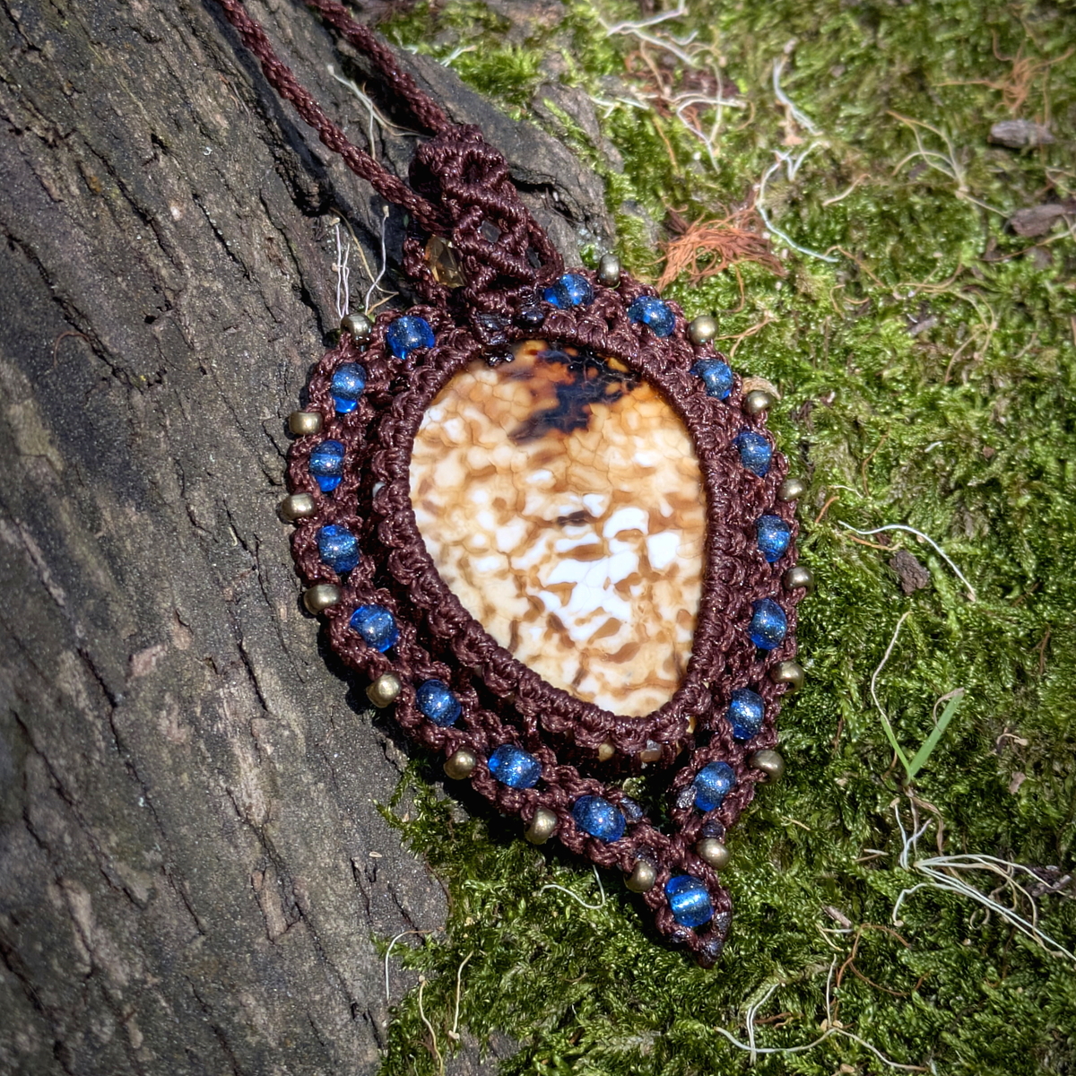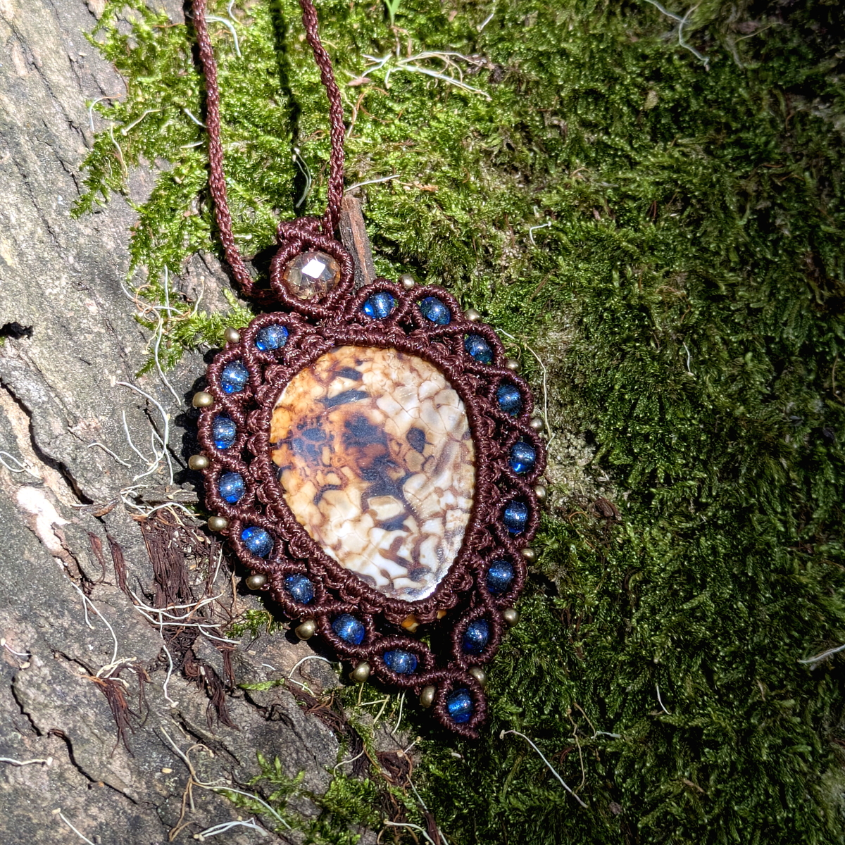 This elegant handmade macrame pendant features a warm-toned agate cabochon framed with soft blue beads. Its graceful inverted teardrop shape and detailed knotwork make it a unique piece of boho stone jewelry โ light, eye-catching, and full of character.