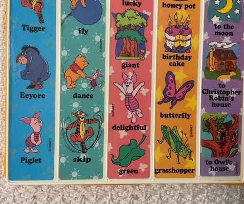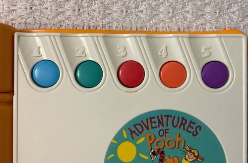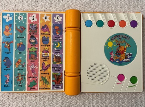 "See 'n Say Story Maker. 'Adventures of Pooh.' When you push the buttons, you can make up silly sentences and stories. You just select a phrase from each column until you have the story you want. There is also a Surprise button you push to hear a surprise sentence. Great for young kids to learn words and sentences."