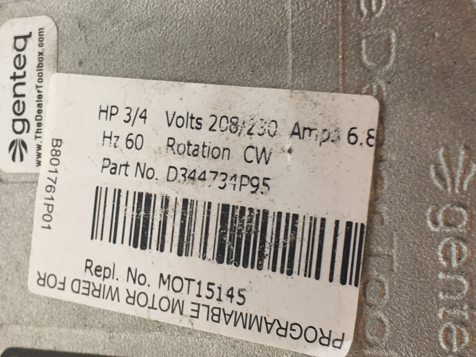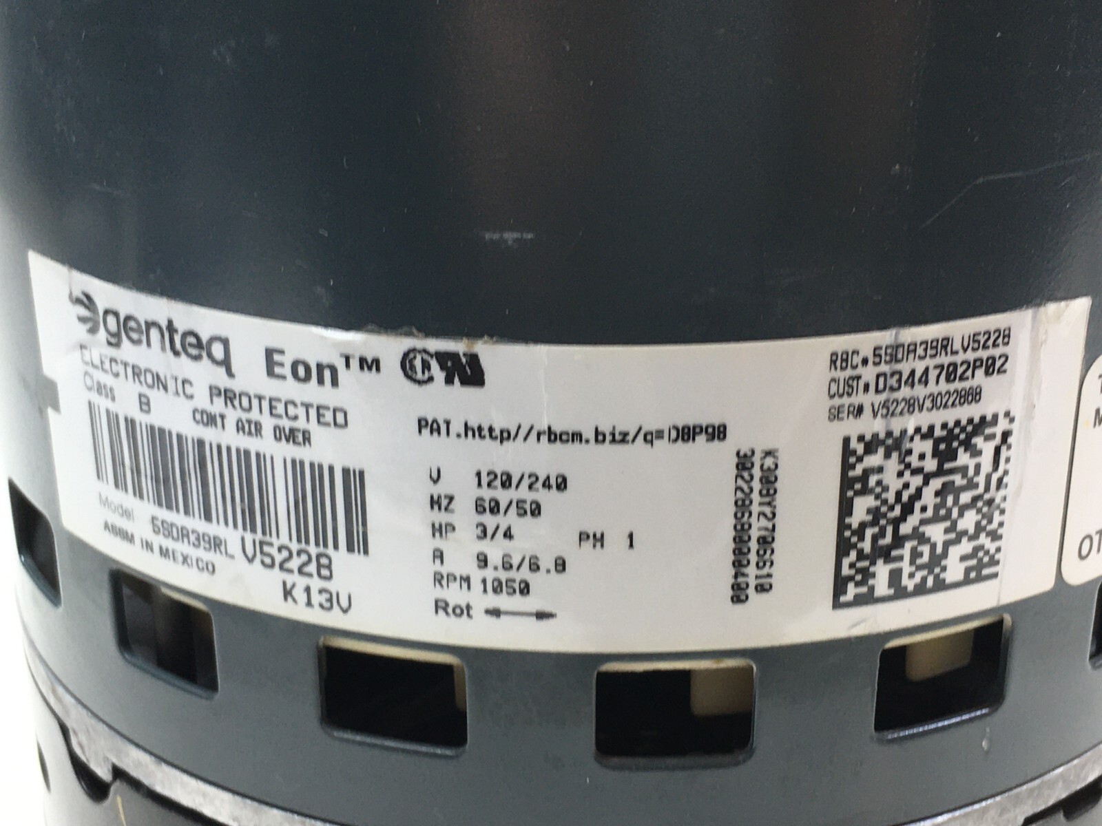 This is Genteq Eon HD02 5SDA39RLV5228 Progr. Blower Motor 3/4HP 230V for Trane p/n D344734P95 MOT15145 CW LE rotation used part.