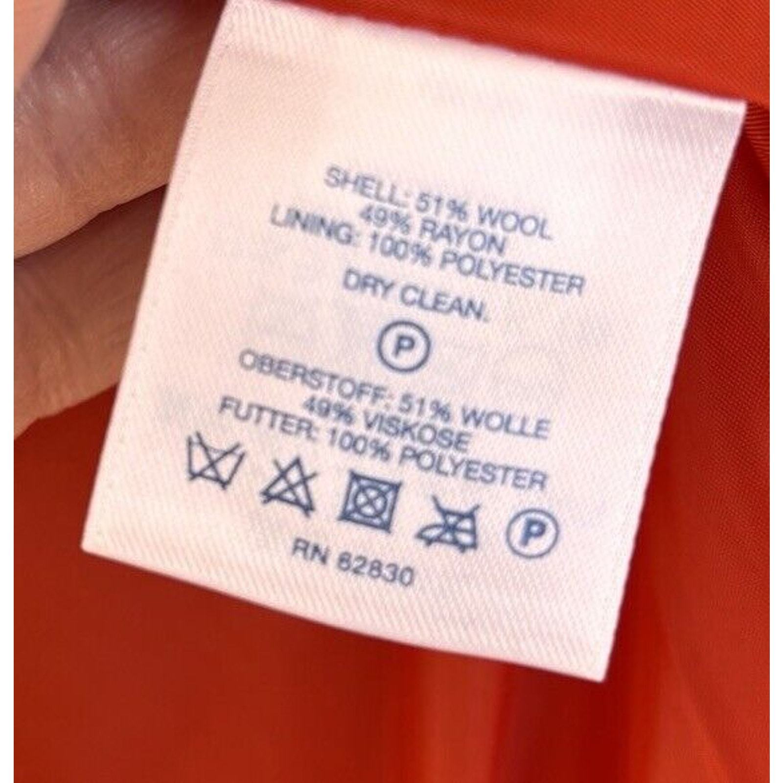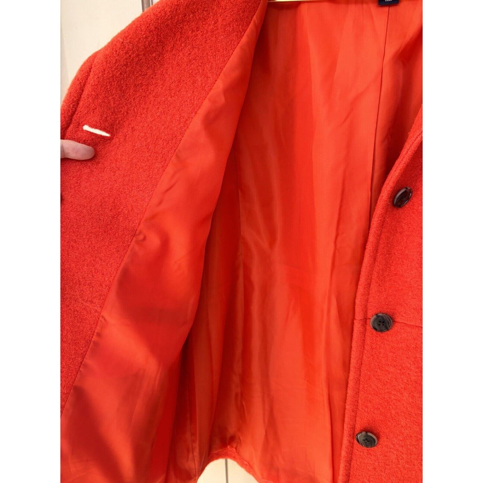 The jacket has a solid pattern and is lined with polyester. It comes in an orange color and has accents of buttons. The jacket has a classic fit and is suitable for the winter and fall seasons. The jacket has pockets and a collared neckline. The garment care instructions recommend dry cleaning only. The jacket is handmade in China and is perfect for women who want a basic jacket with a vintage touch.
