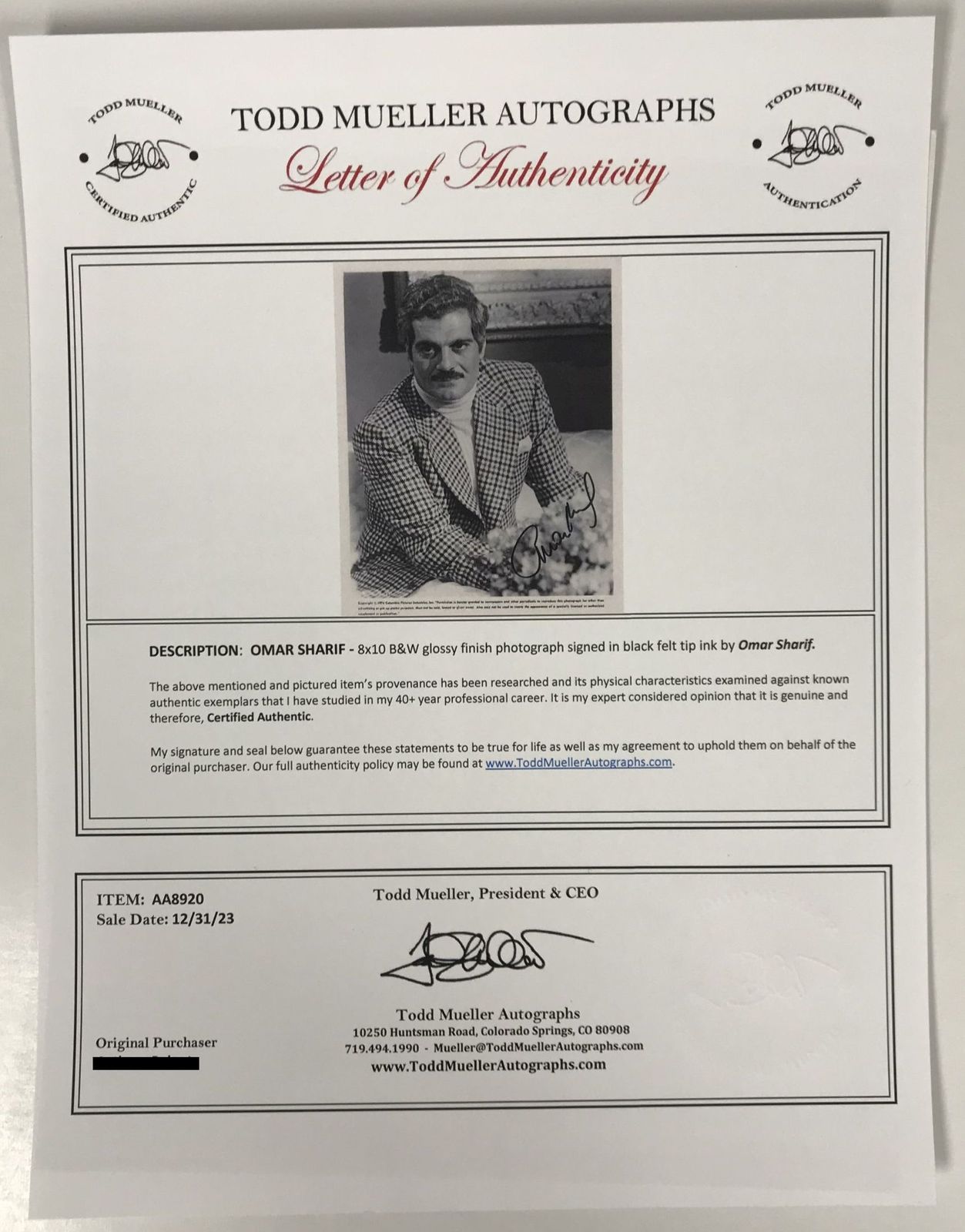 Omar Sharif Signed Autographed Vintage Glossy 8x10 Photo - Todd Mueller COA