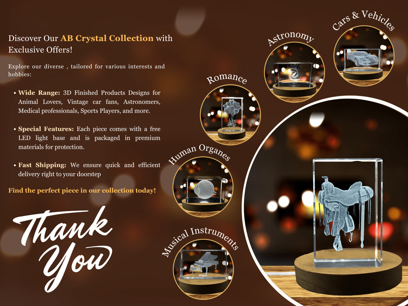 First, our designers create a unique and detailed 3D model. Then, our skilled technicians etch the 3D model into crystal using advanced laser technology.