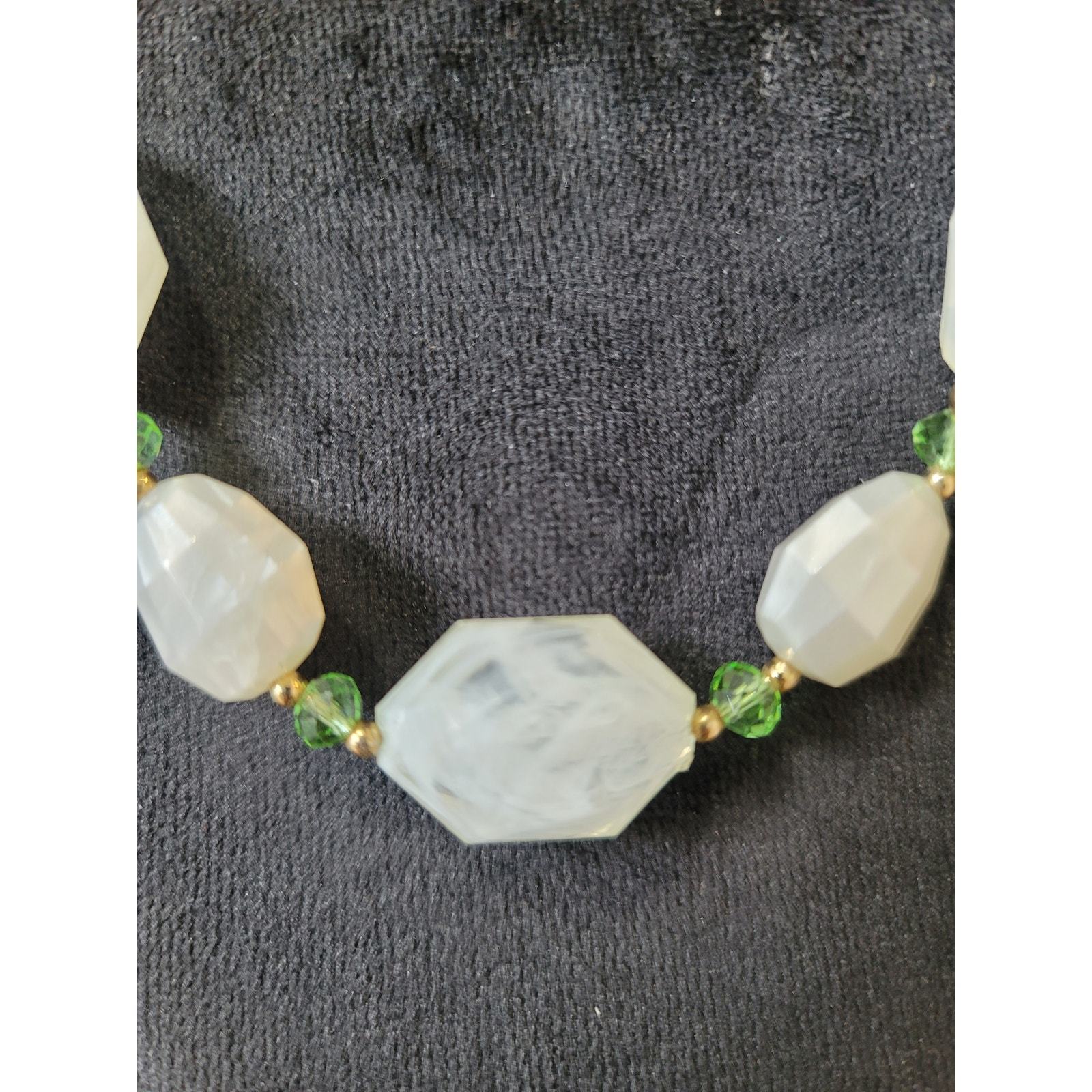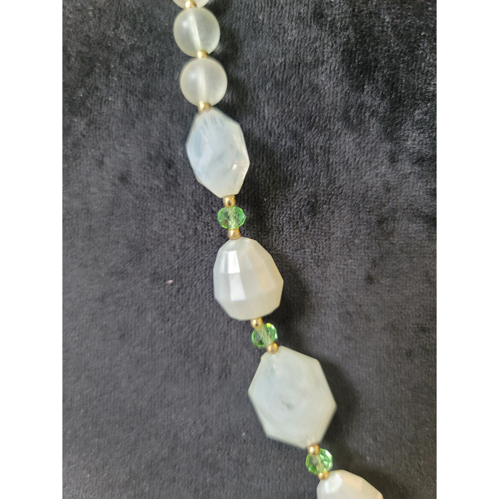 Women's Faceted White Bead Necklace with Green Crystal Accents and Spring Ring