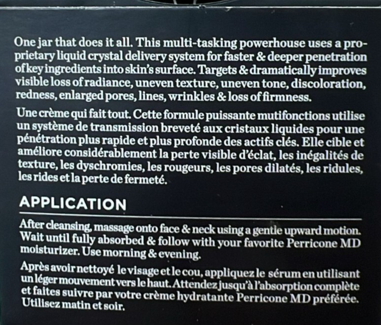 The Perricone MD Cold Plasma Plus+ Advanced Serum Concentrate is a multitasking skincare product designed to address the most visible signs of aging. This serum targets fine lines, wrinkles, uneven skin tone, enlarged pores, discoloration, redness, and loss of firmness. It features a proprietary liquid crystal delivery system for deeper penetration of key ingredients, including Vitamin C Ester, Omegas 3, 6, and 9, and Copper Tripeptide, which work together to brighten, hydrate, and firm the skin.
