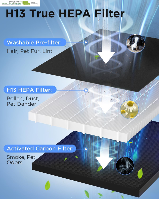 WASHABLE FILTER: Equipped with a high-efficiency 3-stage filtration system, the air cleaner for pets can effectively filter airborne particles as small as 0.3 microns, such as pollen, dust, and pet dander. Cleaning the pre-filter with water or a vacuum cleaner will help extend the life of the H13 HEPA filter. More activated carbon pellets help absorb a bad odor such as pet odors, fumes and VOCs