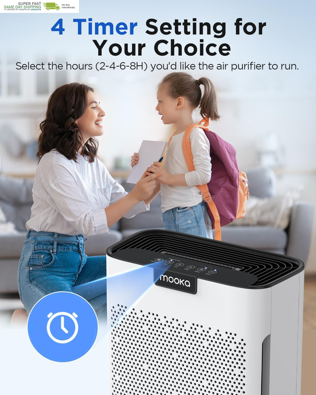 4 TIMER 4 FAN SPEED: The room air purifier has 4 adjustable fan speeds. You can choose the fan speed according to the air quality. The higher the wind speed, the faster the purification speed. You can also turn on the timer when you sleep or go out, which are 2/4/6/8h