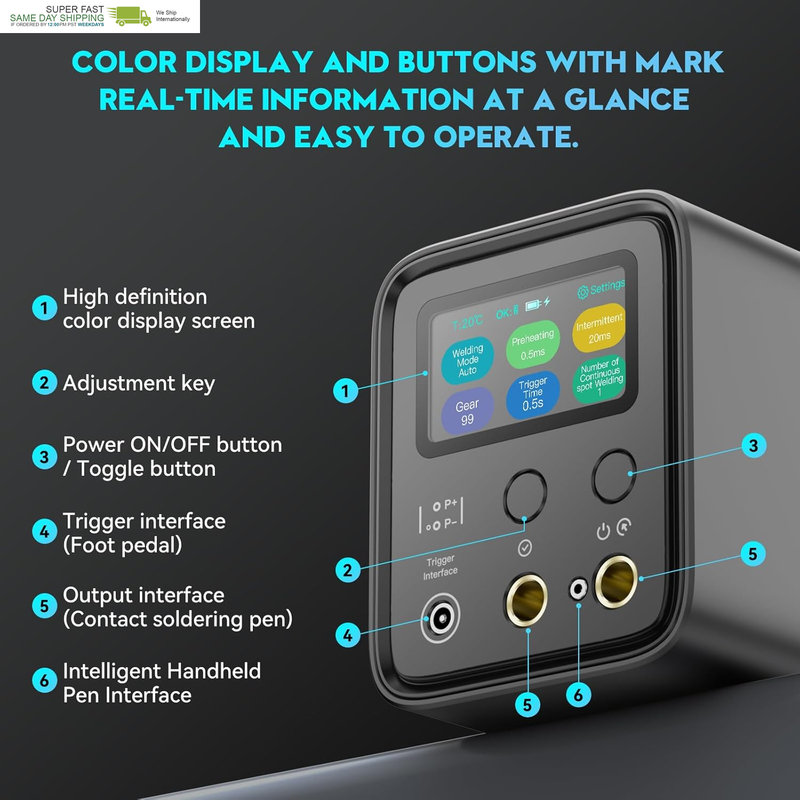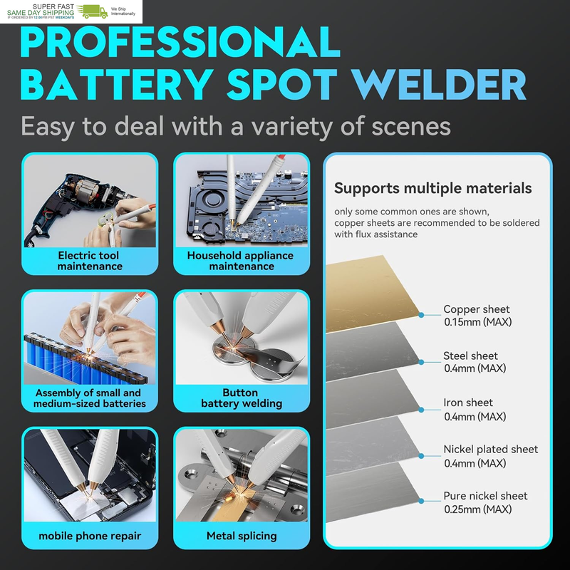 5 Minute Quick Start Spot Welder: We use a wide voltage input of 100-240V and an adapter of 15amp high current for fast charging Connect the spot welding machine to the power supply using our adapter, and quickly reach the spot welding mark within 5 minutes (the display screen shows OK for spot welding), which can be used anywhere in the world