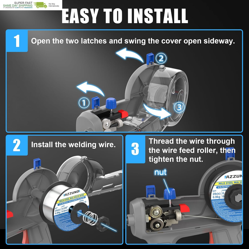 ?Packing List?: AZZUNO Handheld MIG Welder1, .030"/1lb Flux Core Wire1, Contact Tip2, .035" K Groove Drive Roller1, Ground Clamp1, Brush Hammer1, User Manual1.