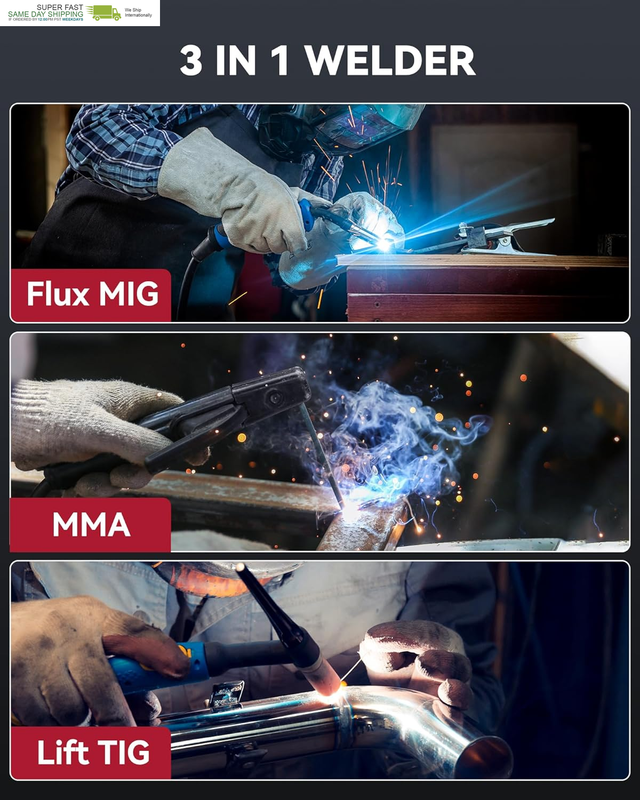 3-IN-1 WELDER: 3 welding modes Flux Core Gasless MIG/ Lift TIG/ MMA meet your different requirements (Need to buy extra Lift tig torch). Adjust the current and 10-speed variable feed controls for perfectly managed flux-cored welding of carbon steel, stainless or even thicker steel, Ideal for home DIY, outdoor repairs, rusty metal, farm and road equipment, and maintenance and repairs.
