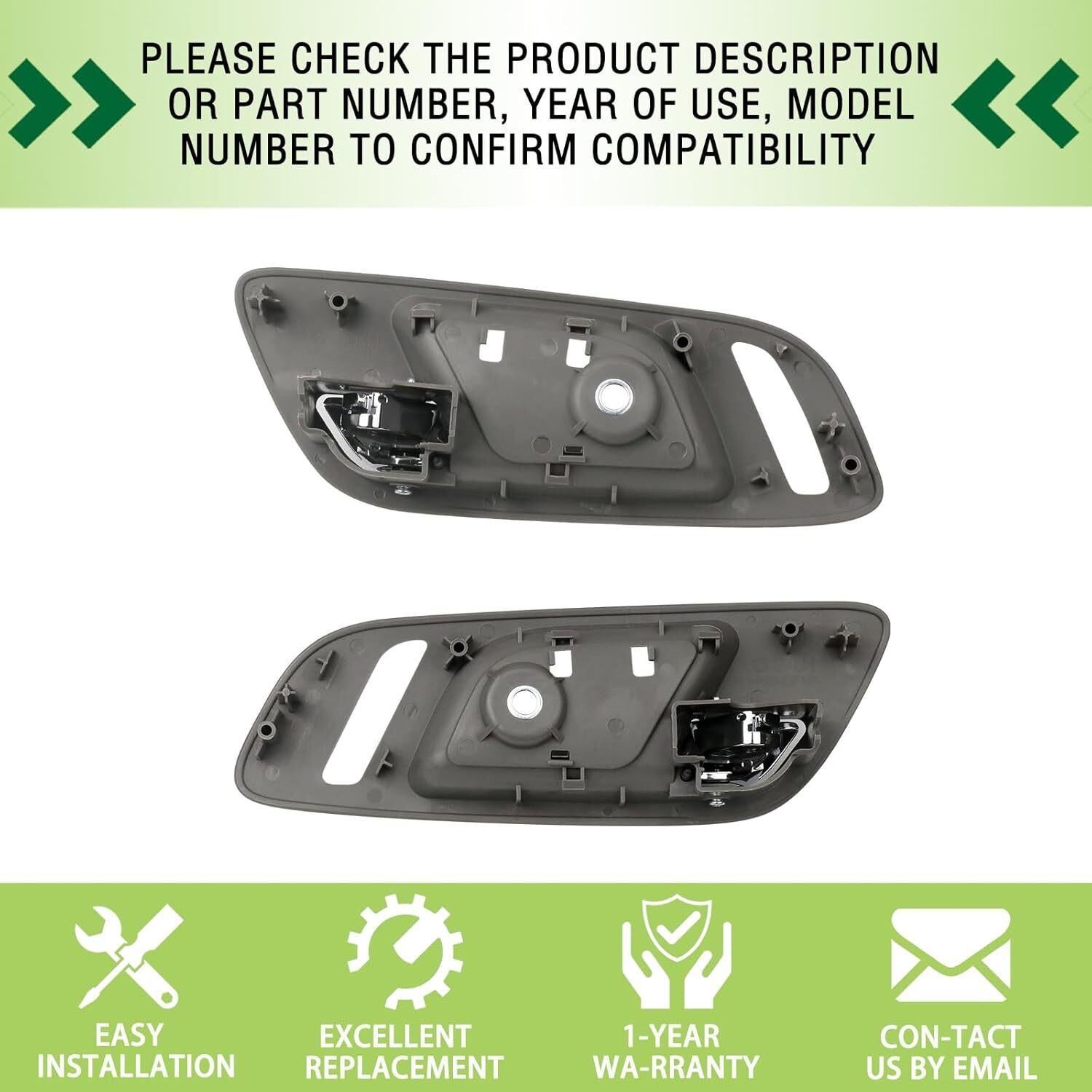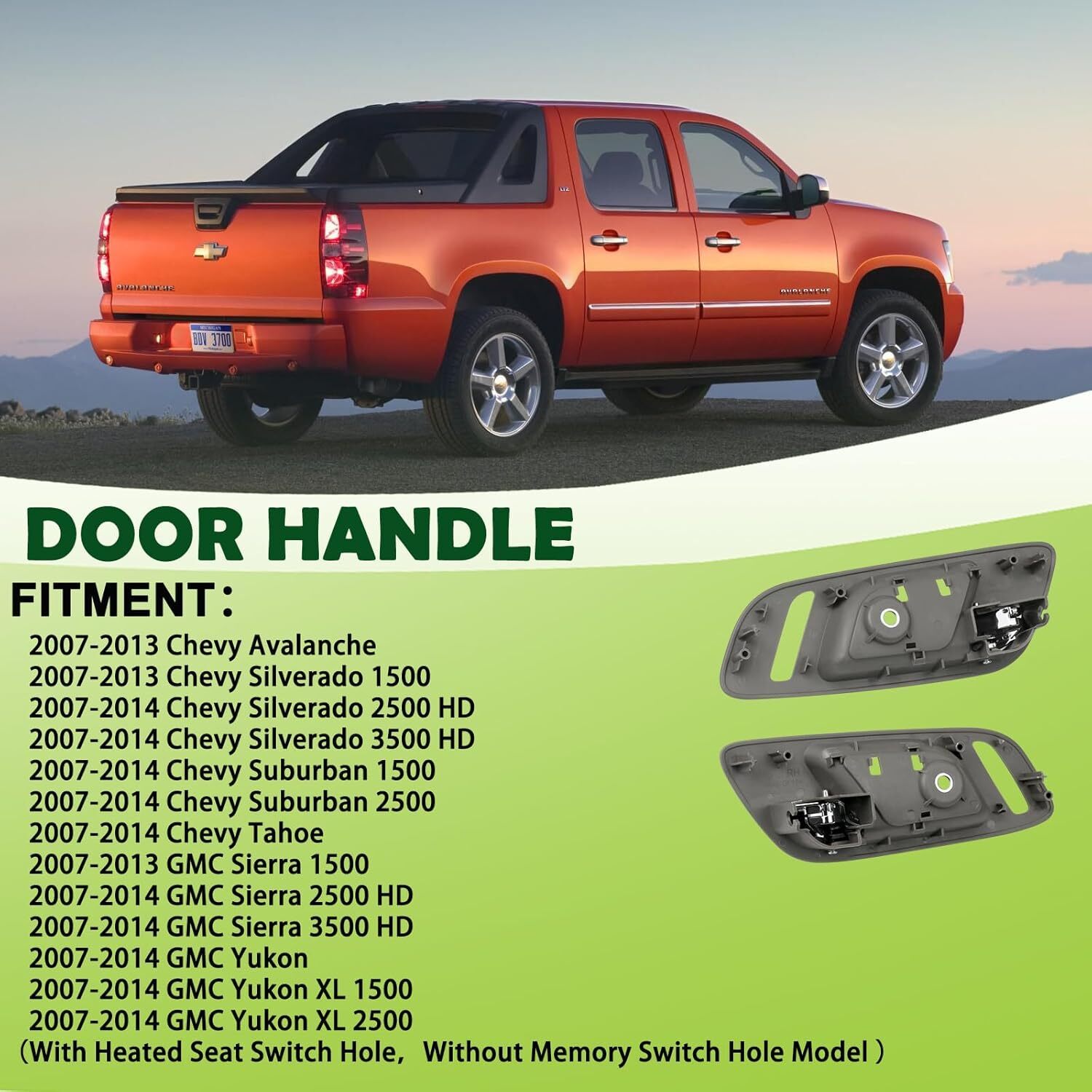 REPLACEMENT PART NUMBER: 15947937 22855622 81191 15935956 15908335 COMPATIBLE WITH: This Inside door handle set fit for 2007-2013 Chevy Avalanche,2007-2014 Chevy Silverado 1500 2500 HD 3500 HD/ Suburban 1500 2500/Tahoe,2017-2014 GMC Sierra 1500 2500 HD 3500 HD /Yukon XL 1500 2500,Please refer to the vehicle compatibility above to ensure proper part FEATURES: The front left right side inner door handle with upgraded plastic process,high hardness,oxidation resistance,heat resistance, corrosion resistance,replacement of new parts and car perfect fit,Solve your safety problems while making your car look new and more beautiful SERVICE LIFE EASY INSTALLATION: This front pull handles are not the real original parts,but it uses advanced technology and high-quality materials in line with oem standards,more effective extension of service life,directly replace the old handle, easy to install can save you time and money BUY WITH CONFIDENCE: 1-Year Warranty.If you have any questions or concerns about the Interior door handle set of 2,please contact us by email and we will provide you with satisfactory service support