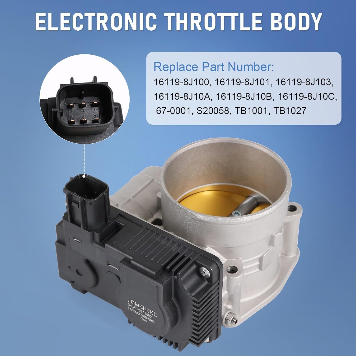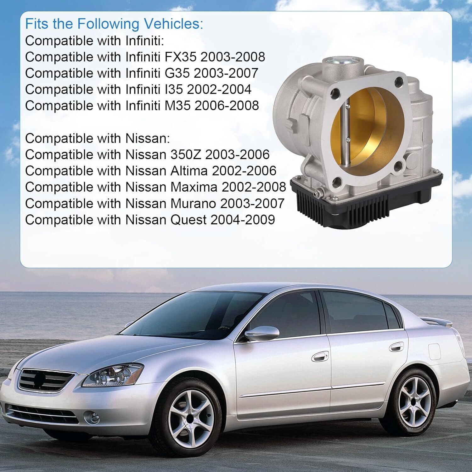 [COMPATIBLE WITH] Compatible with Infiniti FX35 2003-2008, compatible with Infiniti G35 2003-2006, compatible with Infiniti I35 2002-2004, compatible with Infiniti M35 2006-2008. Compatible with Nissan 350Z 2003-2006, compatible with Nissan Altima 2002-2006, compatible with Nissan Maxima 2002-2008, compatible with Nissan Murano 2003-2007, compatible with Nissan Quest 2004-2009. [REPLACE PART NUMBER] 16119-8J100, 16119-8J101, 16119-8J103, 16119-8J10A, 16119-8J10B, 16119-8J10C. Please check the part number and fitment before placing order. [QUALITY ASSURANCE] High quality and rigorous testing. This throttle body is made of high quality material for high precision and durability. And it had undergone rigorous testing and inspecting to ensure all performance parameters meet the standard, ensure long time to use. [OEM FIT] Upgrade critical component parts include the housing, throttle plate, position sensors and throttle actuator motor meet or exceed OE standard. It is comparable in fit, form and function to the original part, ensures proper fit and performance. [EASY TO INSTALL] This electronic throttle body can be easy to install. Directly plugs into the original equipment wiring harness with no adapter required, which save much time.