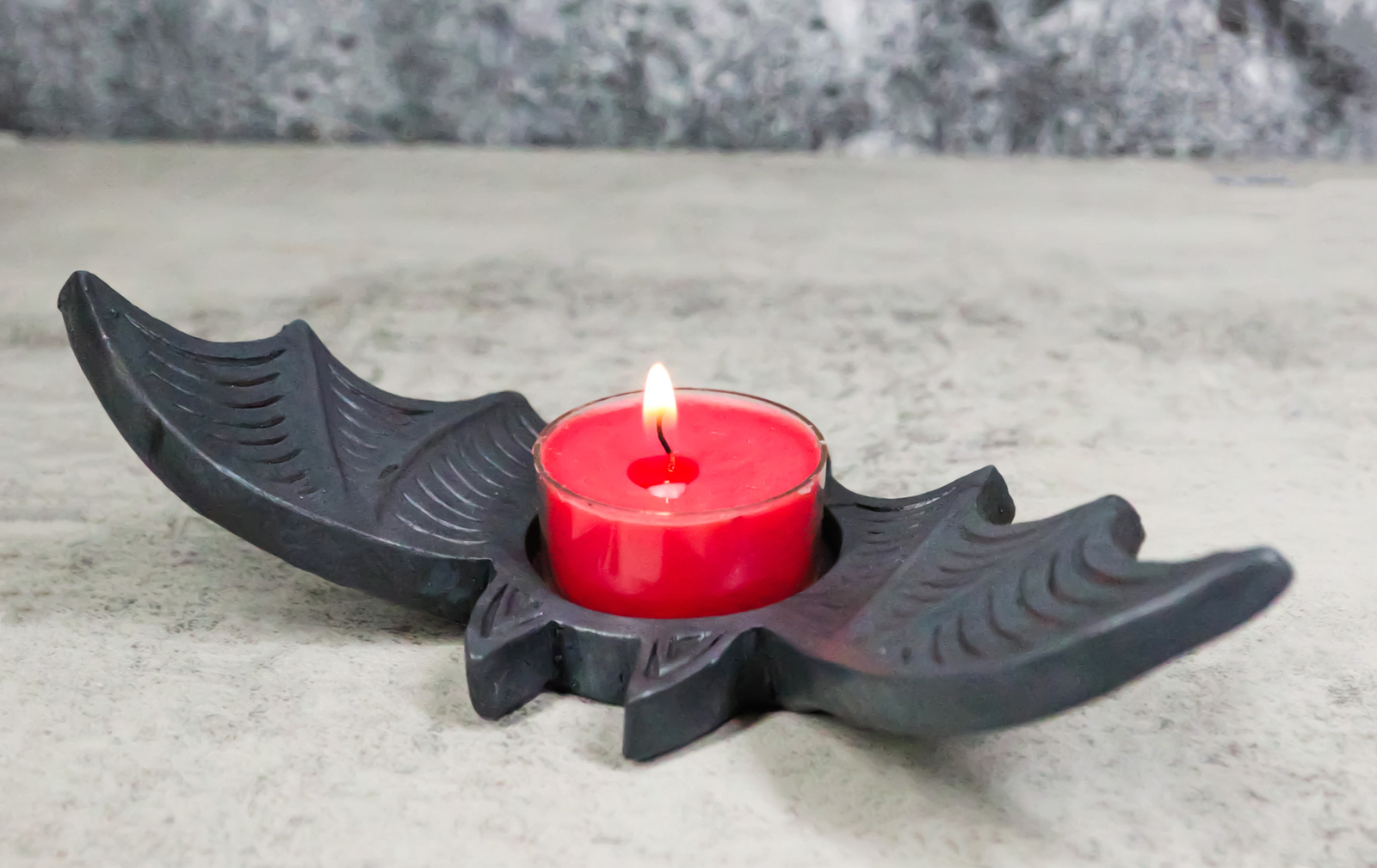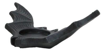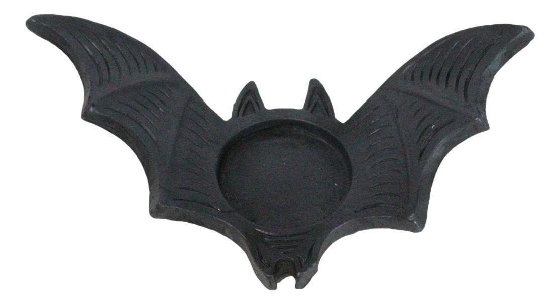 ? A perfect addition to Halloween decor or for lovers of all things creepy. This sleek tealight holder features a flying bat design complete with intricate wings and a deep black finish. Accommodates a standard single tealight for casting captivating shadows and creating a mesmerizing ambiance. Ideal for enhancing both modern and eclectic interior spaces.