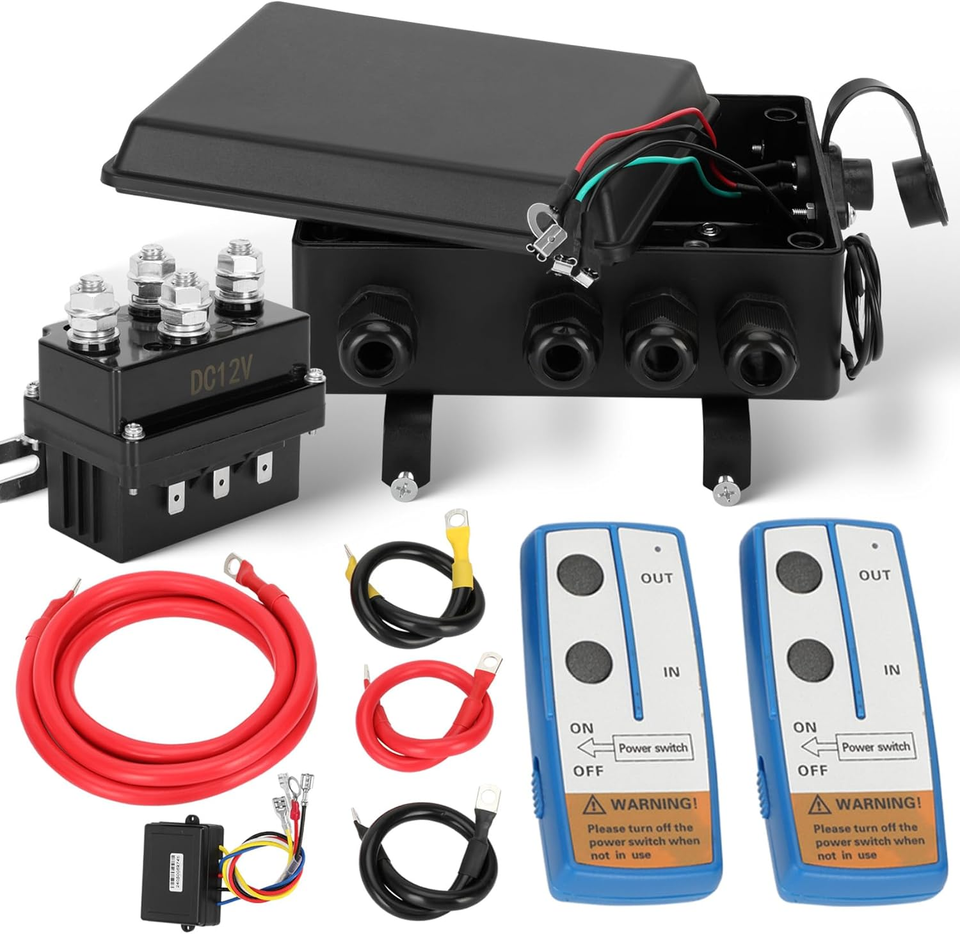 1x 12V 500A Winch Solenoid Relay, 1x 12V Winch Receiver, 2 x 12V Winch Remote Control, 1x relay box, 3x 6ft AWG4 cables with lugs, 1x 16.1-inch AWG4 cables with lugs