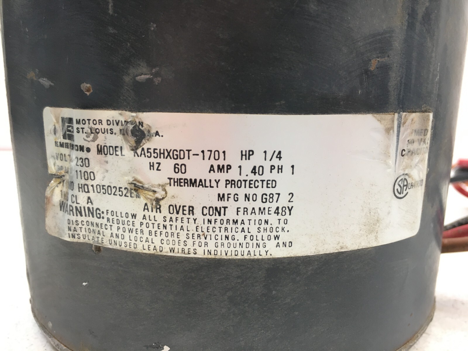 This is EMERSON K55HXGDT-1701 Fan Motor HP 1/4 RPM 1100 230V 1PH HQ1050252EM used part.