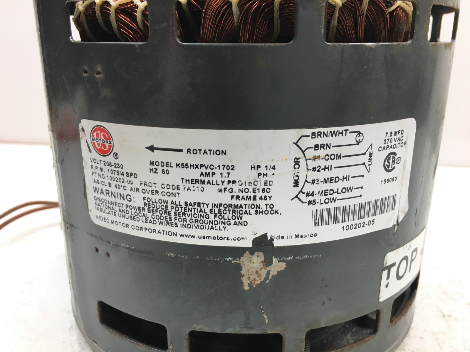 This is US Motors K55HXPVC-1702 Lennox 100202-05 1/4 HP 208/230V RPM 1075/4 SPD Blower Motor used part.