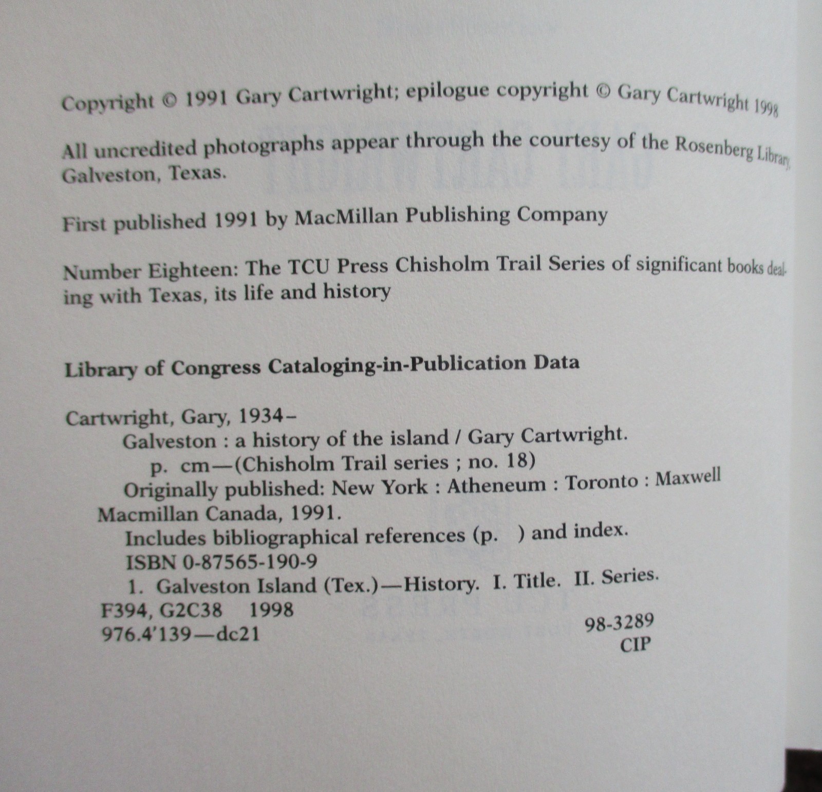6" x 9", 358 page trade paperback, TCU Press, ISBN # 978-0-87565-190-3, First TCU Press Edition (unstated), Copyright 1998
