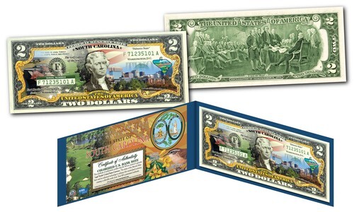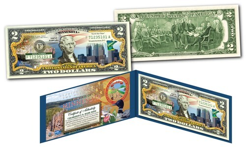 See the U.S.A. as never before with the All-New U.S. $2 Statehood Bills Currency Collection, a spectacular presentation. This all-new collection of Statehood $2 Bills honors each of our 50 states, and comes packaged in a premium display folio that shows both your States bill and the highly customized official States Certificate of Authenticity. You'll enjoy glimpses of each state's most fascinating sights, symbols, and stunning natural beauty; adding to the effect, the custom artwork also includes imagery inspired by the collector-favorite State Quarters and U.S. Parks. Discover breathtaking American beauties with a rare currency collection that also honors our national parks with brilliant color. While $2 Bills are genuine U.S. legal tender, they make up fewer than 1% of all currency produced today, and these rarely-seen bills are coveted collector favorites. The reverse of each statehood bill features the famous depiction of the signing of the Declaration of Independence. Your bills arrive in crisp Uncirculated Condition. Celebrate these magnificent works of art of America's history.