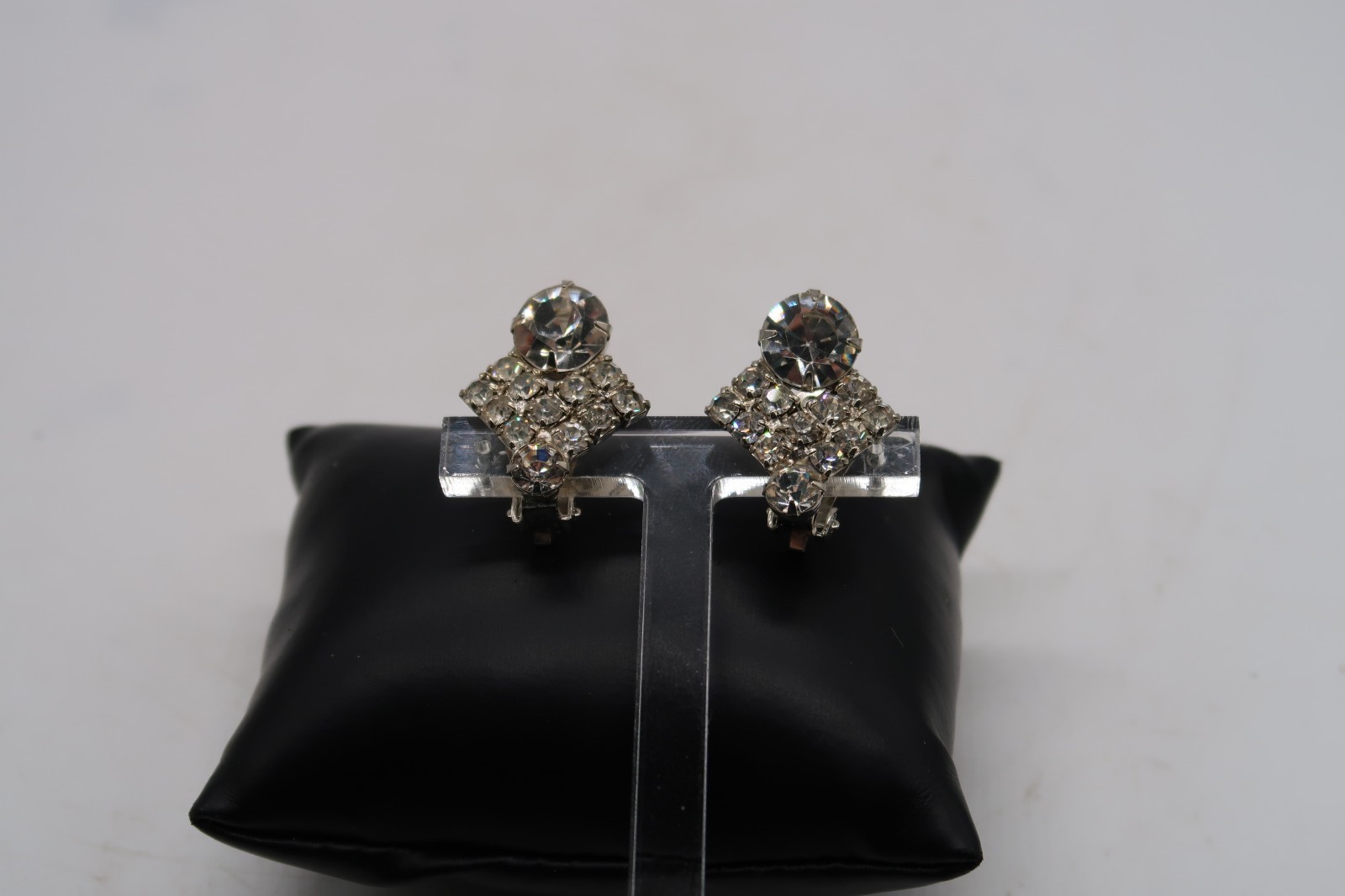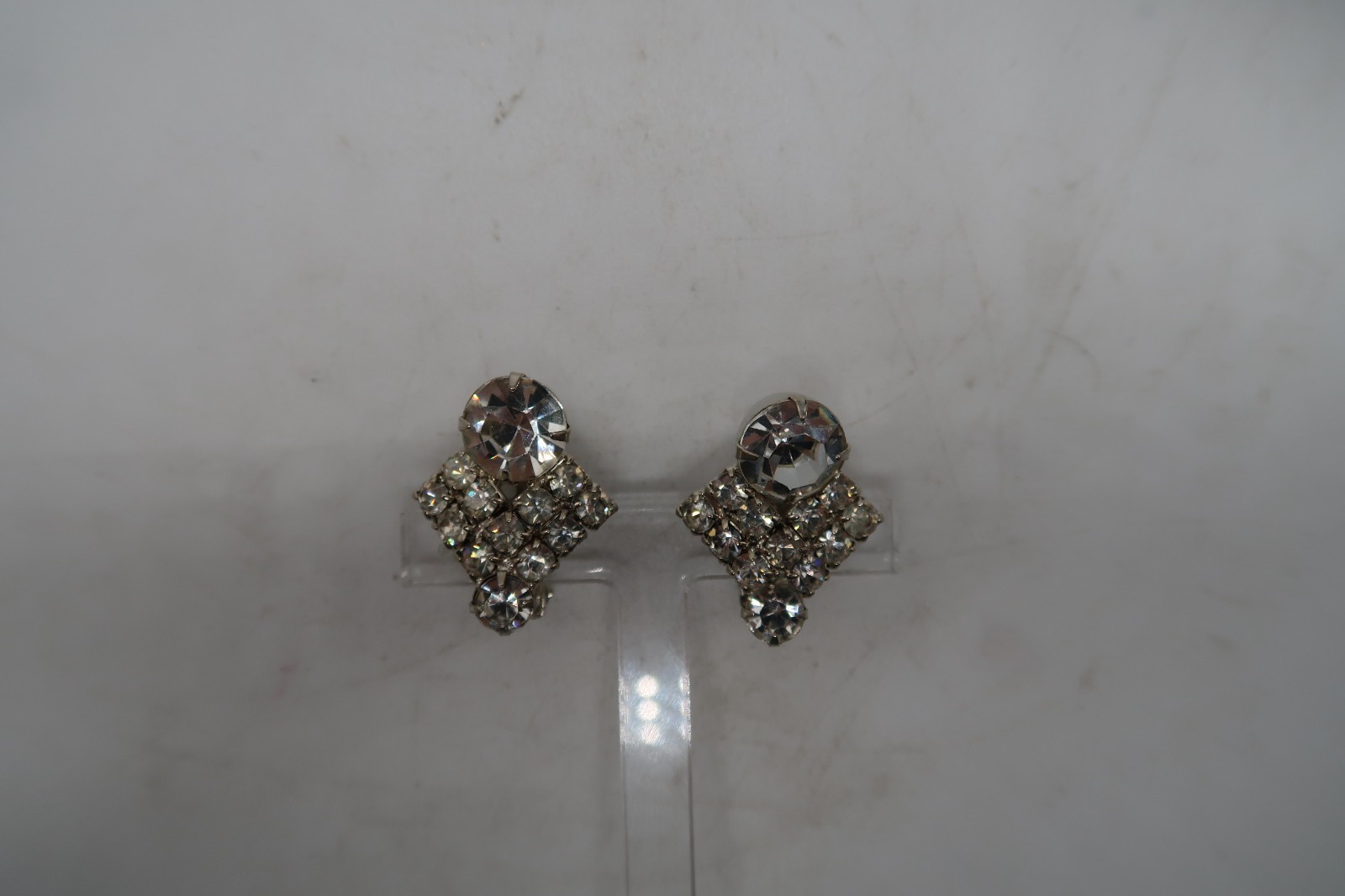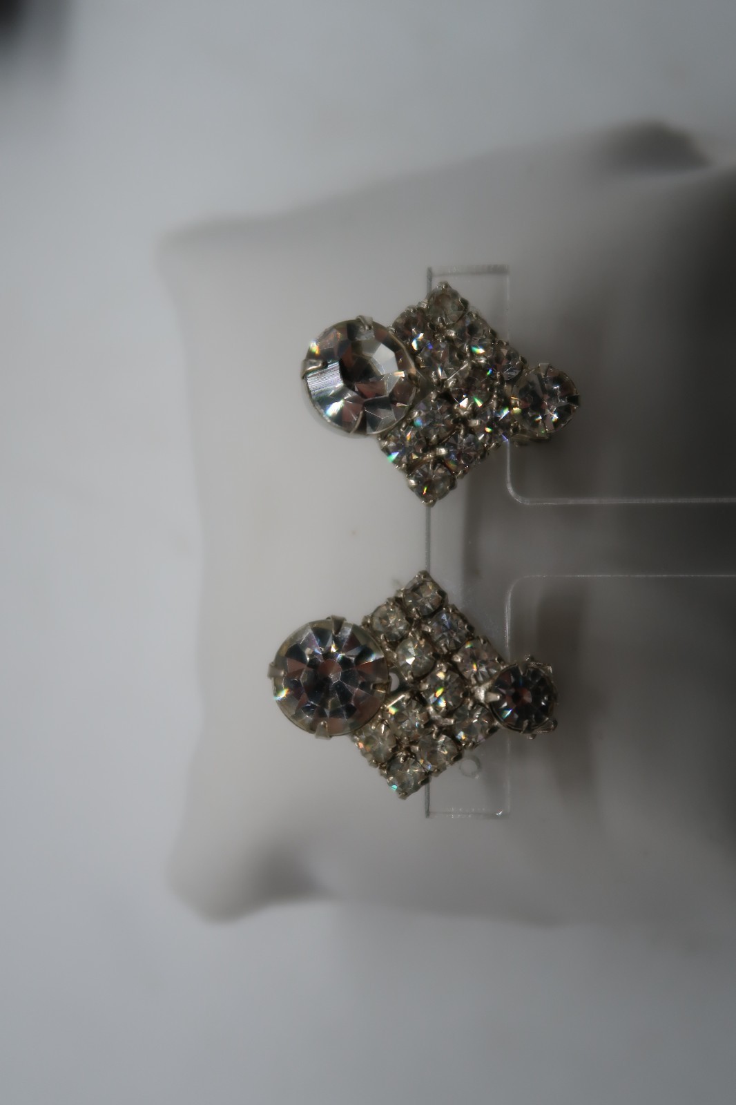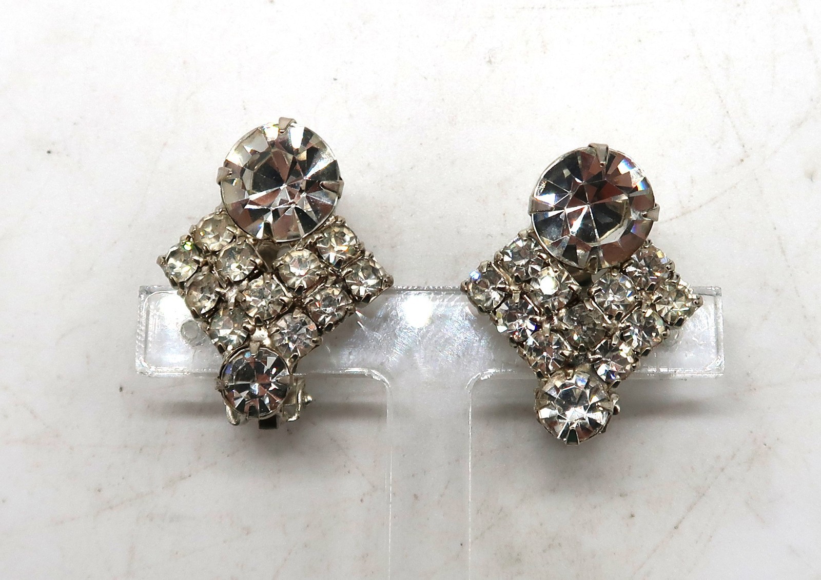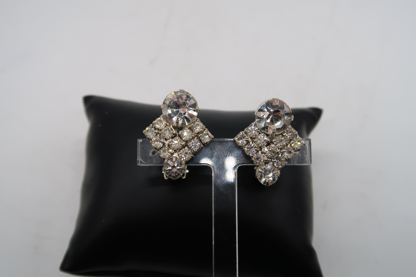 Vtg Diamond Pattern Clear Rhinestone Prong Set Clip-on Silver Tone Earrings
