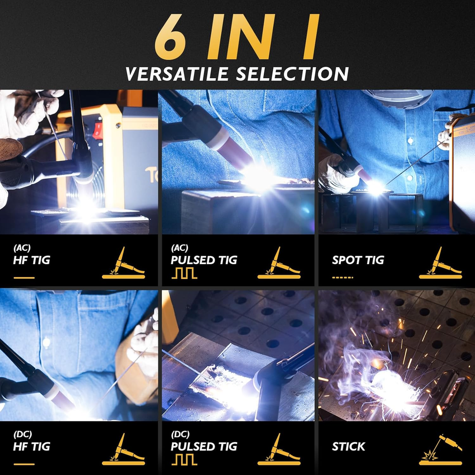 6-in-1 Welding Modes: The TOOLIOM TL-200TP ACDC PRO welder features six versatile welding modes: AC TIG, DC TIG, AC Pulsed TIG, DC Pulsed TIG, Stick, and TIG Spot Welding, making it suitable for a wide range of welding applications and conditions.