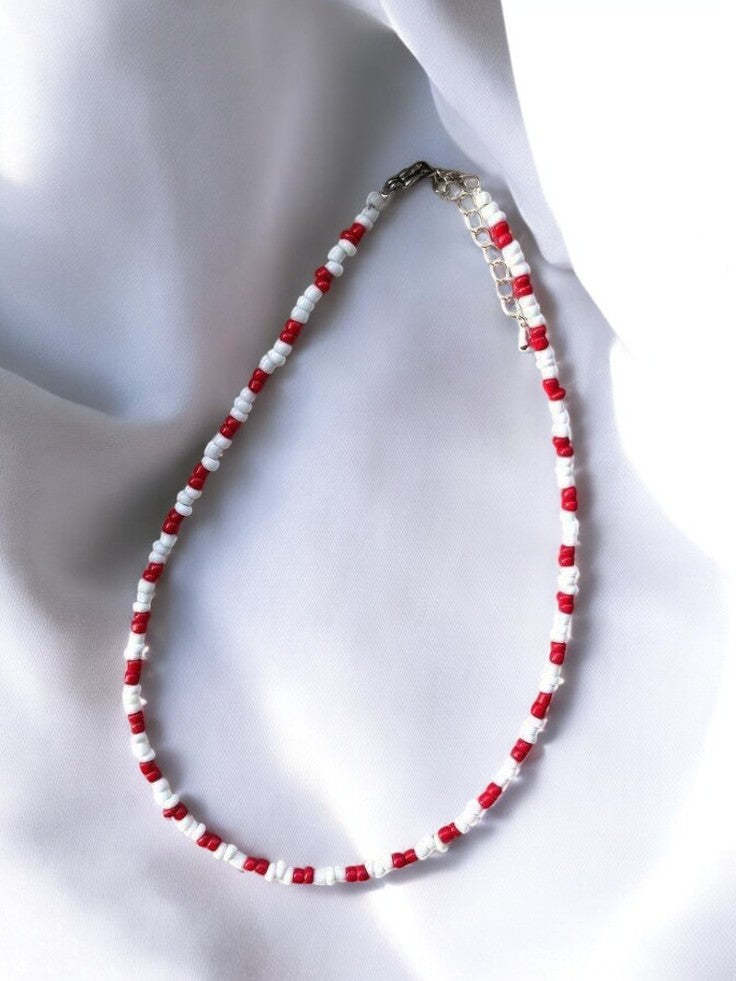 A minimalistic necklace featuring alternating red and white beads, perfect for adding a subtle pop of color to your outfit. Lightweight and versatile, it?s ideal for everyday wear or casual occasions.
