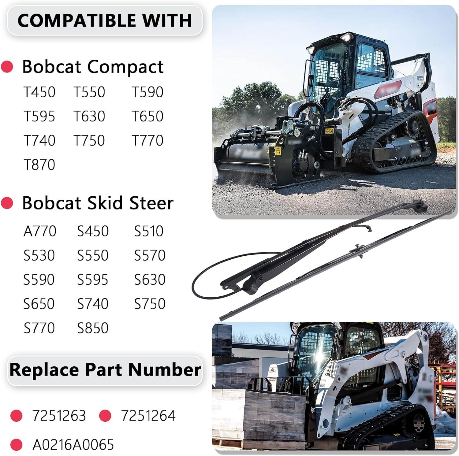 ?COMPATIBILITY?Compatible with Bobcat Compact Track Loader Models: T450 T550 T590 T595 T630 T650 T740 T750 T770 T870; Bobcat Skid Steer Loader Models: A770 S450 S510 S530 S550 S570 S590 S595 S630 S650 S740 S750 S770 S850. ?EASY INSTALLATION?Direct replacement for the original one, easy to install. ?PREMIUM QUALITY?Made of high-quality material, durable and stable, undergo rigorous inspection before shipping. ?REPLACE PART NUMBER?7251263, 7251264, A0216A0065 ?EXCELLENT SERVICE?We provide carefree REPLACEMENT, you can buy it with confidence. If you have any question about the windshield wiper arm and wiper blade kit, please don't hesitate to contact us and we are eager to provide you with the best possible assistance.