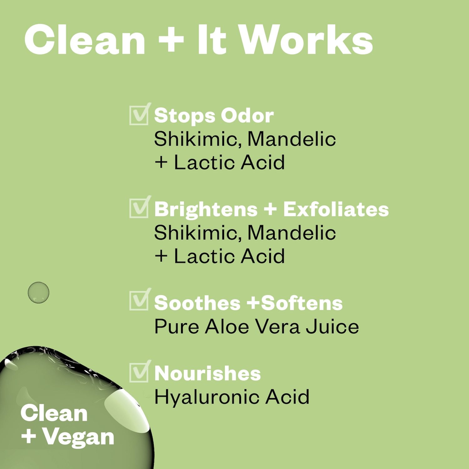 What Else You Need to Know: Featuring a blend of shikimic, mandelic, and lactic acids, this deodorant targets odor where it starts by supporting a pH environment where odor-causing bacteria can?t survive. Free from aluminum and baking soda, the cooling formula soothes skin, visibly brightens, helps prevent the occurrence of ingrown hairs, and feels good to roll on.