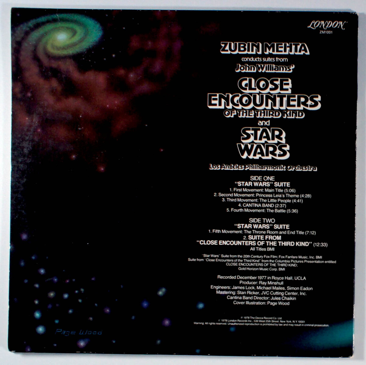 Star Wars and Close Encounters of the Third Kind, conducted by Zubin Mehta with the Los Angeles Philharmonic Orchestra, features suites from John Williams' iconic scores for the films. Recorded in December 1977 at Royce Hall, UCLA, the album is celebrated for its rich, high-fidelity sound, with some audiophiles considering it superior to the original soundtrack recordings due to its exceptional performance and production quality. Historically significant as a cultural artifact, it captures the zeitgeist of the late 1970s when these science-fiction films revolutionized cinema and orchestral scoring, showcasing Mehta's ability to interpret Williams' complex compositions with precision and grandeur. The album includes notable tracks like Main Title from Star Wars and the Suite from Close Encounters of the Third Kind. The album was primarily appreciated as a cohesive orchestral work.
