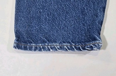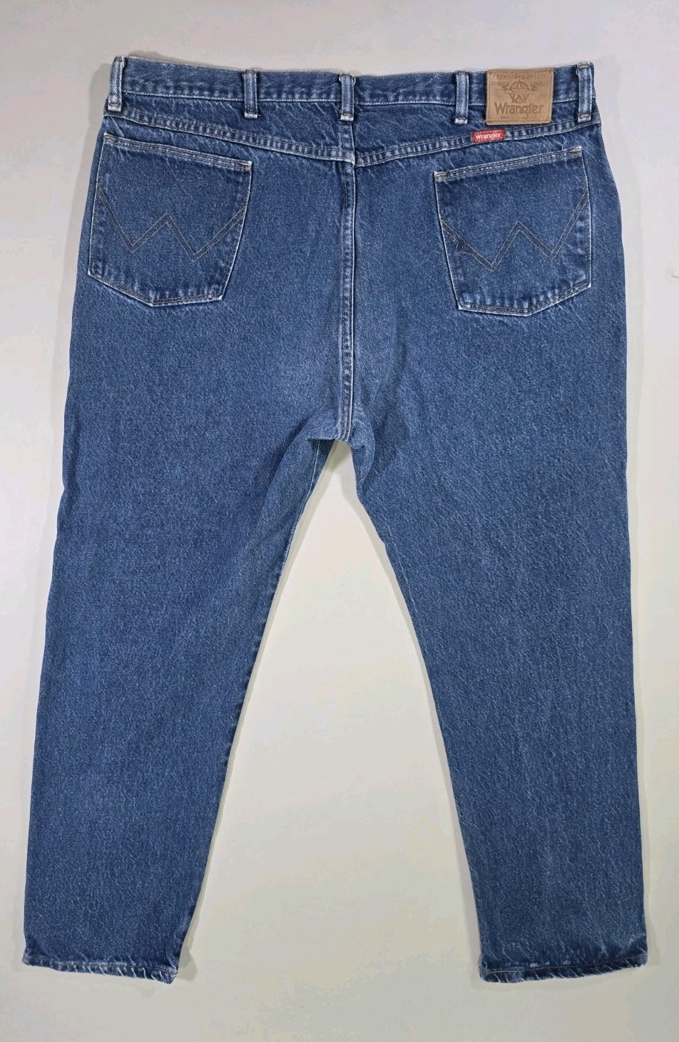 Labeled 42x30 measured 40x30. Some wear at leg cuff please see photos. The product is a pair of vintage Wrangler jeans for men in size 40x30. Made in the USA from cotton denim, these jeans feature a classic blue color and a straight leg style with a high rise waist. They have a traditional 5-pocket design with a zipper and button closure, and are machine washable for easy care. The denim fabric wash is medium, and the design includes a leather tag accent. Perfect for any season, these Wrangler jeans offer a timeless American style that is both durable and comfortable.