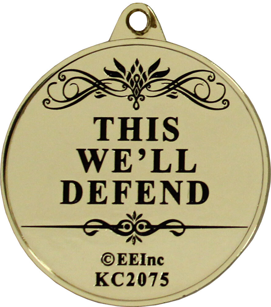 Our Army metal keyrings measure 1.5" in diameter and include a polished metal double ring to hold keys securely. These keyrings are die-struck in gold metal, then filled with colored enamel creating a bright and durable finish. The double-sided design featuresthe official US Army Seal on the front, and the motto "This We'll Defend" on the back.