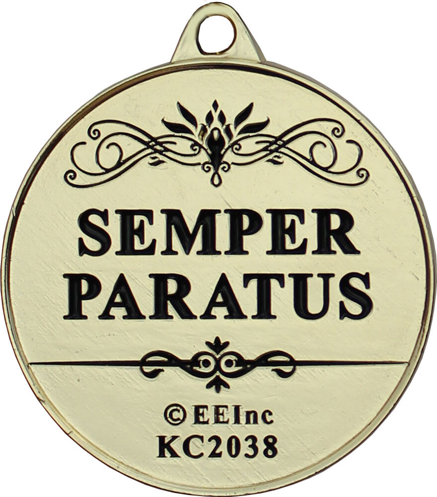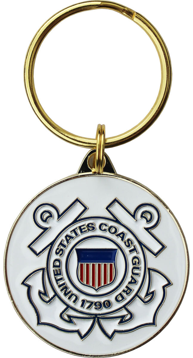 Our Coast Guardmetal keyrings measure 1.5" in diameter and include a polished metal double ring to hold keys securely. These keyrings are die-struck in gold metal, then filled with colored enamel creating a bright and durable finish. The double-sided design featuresthe official US Coast Guard Seal on the front, and the motto "Semper Paratus" on the back.