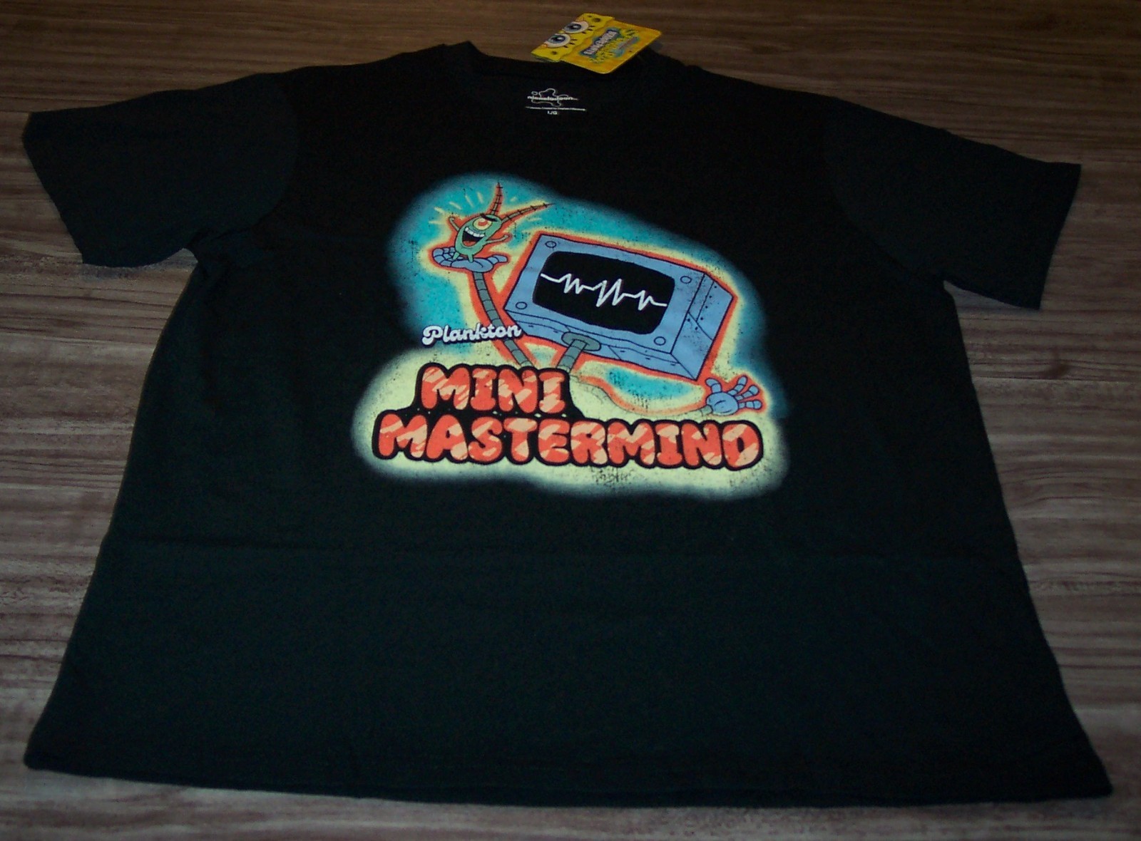This is a Vintage Style Nickelodeon SPONGEBOB SQUAREPANTS PLANKTON Mini Mastermind T-shirt. It is a size LARGE, and it is NEW with the tag. It is 22 inches from armpit to armpit and 29 inches in length. The print is made to look vintage. Combine auctions to save on shipping. AD