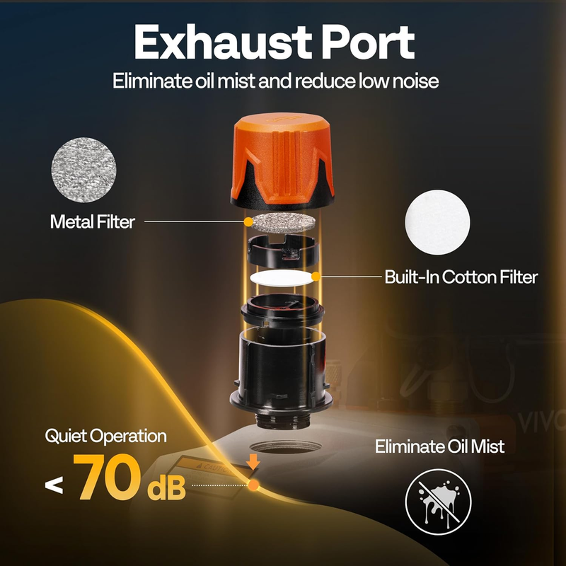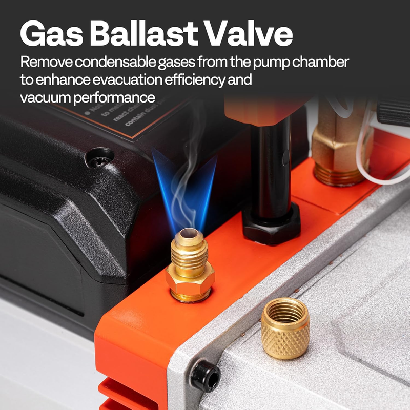 EFFICIENT COOLING FILTRATION: This 14.4 CFM vacuum pump features a powerful internal fan, T-shaped motor cooling fins, and mesh ventilation ports, which ensures fast cooling and prevents motor overheating; A coarse filter at the intake effectively blocks dust and debris from entering the pump, while the exhaust filter separates oil mist from exhaust gases to improve filtration efficiency; The built-in anti-backflow design prevents oil from returning to the system, ensuring safe, stable, and clean operation