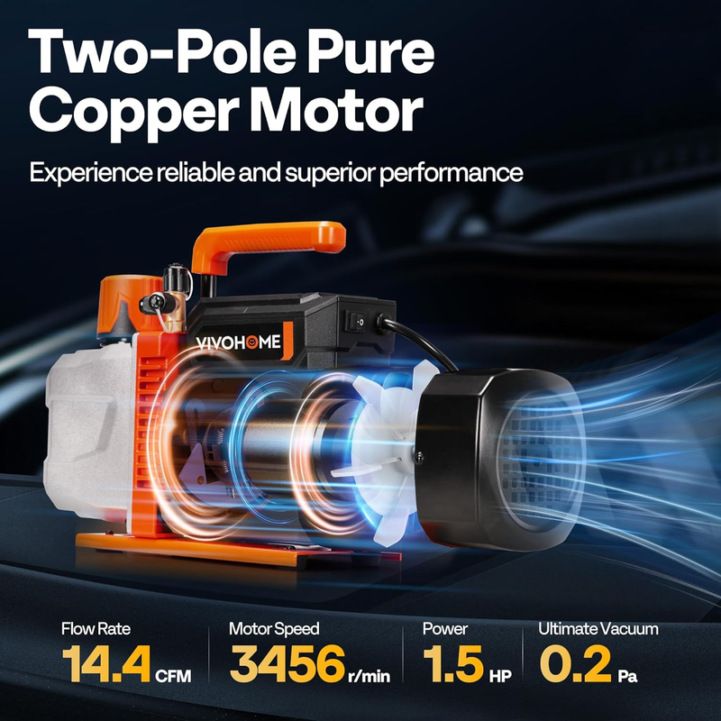 PREMIUM VACUUM PUMP: This VIVOHOME VG Series dual-stage vacuum pump delivers outstanding performance with a 1.5 HP pure copper motor; Running at 3456 RPM, it achieves a fast flow rate of 14.4 CFM (408 L/min), ensuring efficient air removal during HVAC and refrigeration servicing; The pump reaches an ultimate vacuum of 15 microns and a partial pressure as low as 0.2 Pa, offering strong suction for deep evacuation; Open the gas ballast valve when pumping moist systems (less than 1 min), and keep it closed for dry systems to reach higher ultimate vacuum