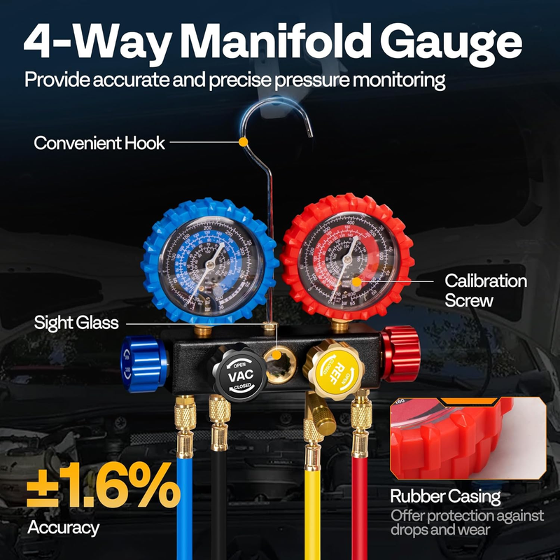 PRECISE GAUGE DURABLE HOSES: The high-precision 4-way manifold gauge provides accurate, reliable readings for HVAC and refrigeration systems; The rubber casing absorbs shocks to prevent internal damage, while a built-in hanging hook frees your hands during operation; Calibration screw offers easy fine-tuning for precise diagnostics; The color-coded hoses?red for high pressure, blue for low pressure, yellow for refrigerant, and black for vacuum - make setup a breeze; Rated for 800 PSI working and 4000 PSI burst pressure, the 5.0 ft rubber hoses remain flexible and durable; The hose lock-off valve ensures secure and airtight seal for a leakproof connection