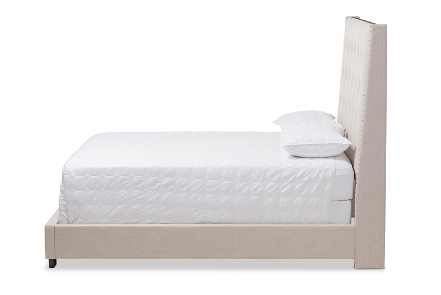 Features: Modern and contemporary bed Light beige fabric upholstery Tall, button-tufted headboard Square headboard and cleanly lined frame Dark bronze nail heads trim Box spring is required Set Includes: One (1) King Size Bed