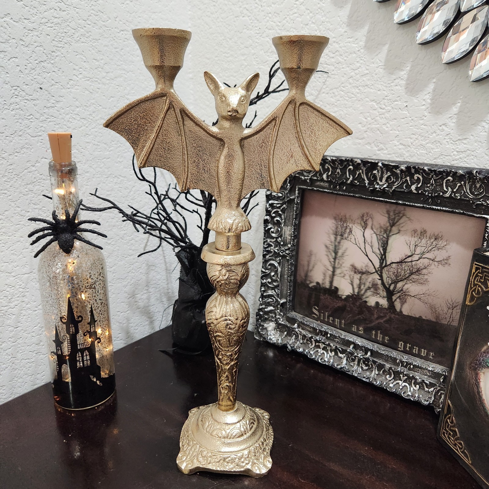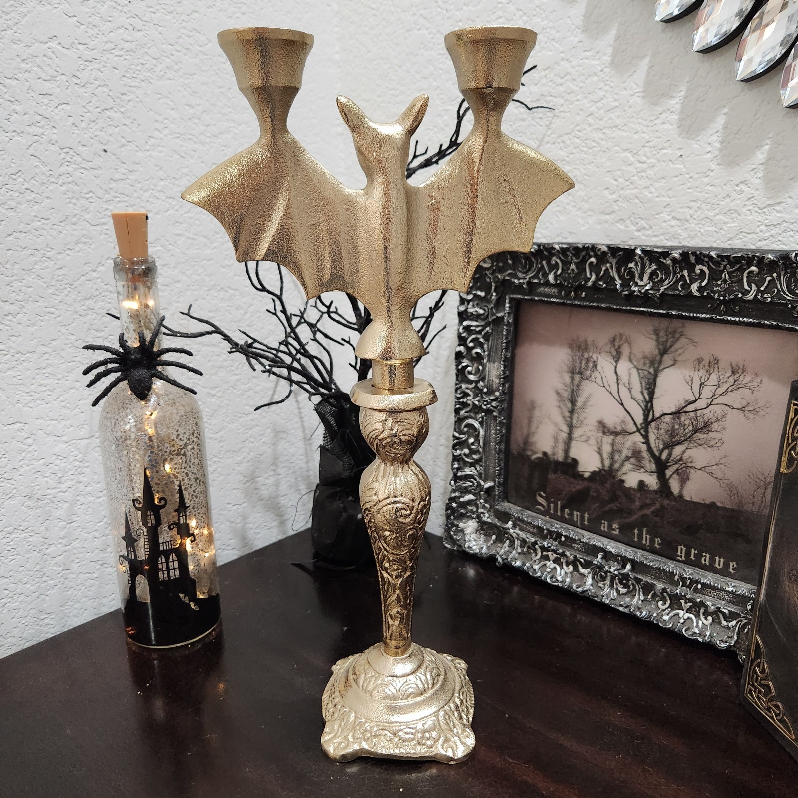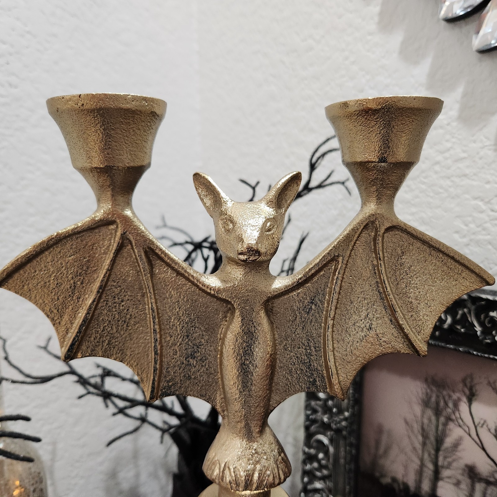 Up for sale is this amazon gold cast iron candle holder for your spooky tabletop decor. The candle holder has a bat in the center with his wings spread out. It holds 2 tapper candles. It's made of cast iron and stands approx 16" tall. NEW