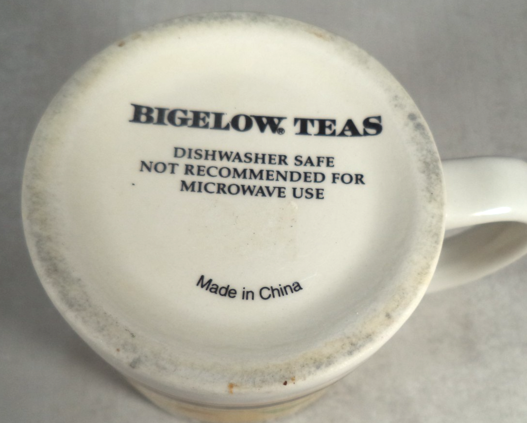 Description: This mug is a charming and durable ceramic piece with a classic round shape and medium size. Perfect for all occasions, this mug can be used for both hot and cold beverages. The vintage design is painted with a white color, featuring the iconic Bigelow brand logo. Made of ceramic and porcelain, this dishwasher-safe mug is a beautiful addition to any kitchen or home decor. Its 11 oz capacity and 3 3/4 inch height make it practical for everyday use, while its original design adds a touch of nostalgia to your tea or coffee routine.