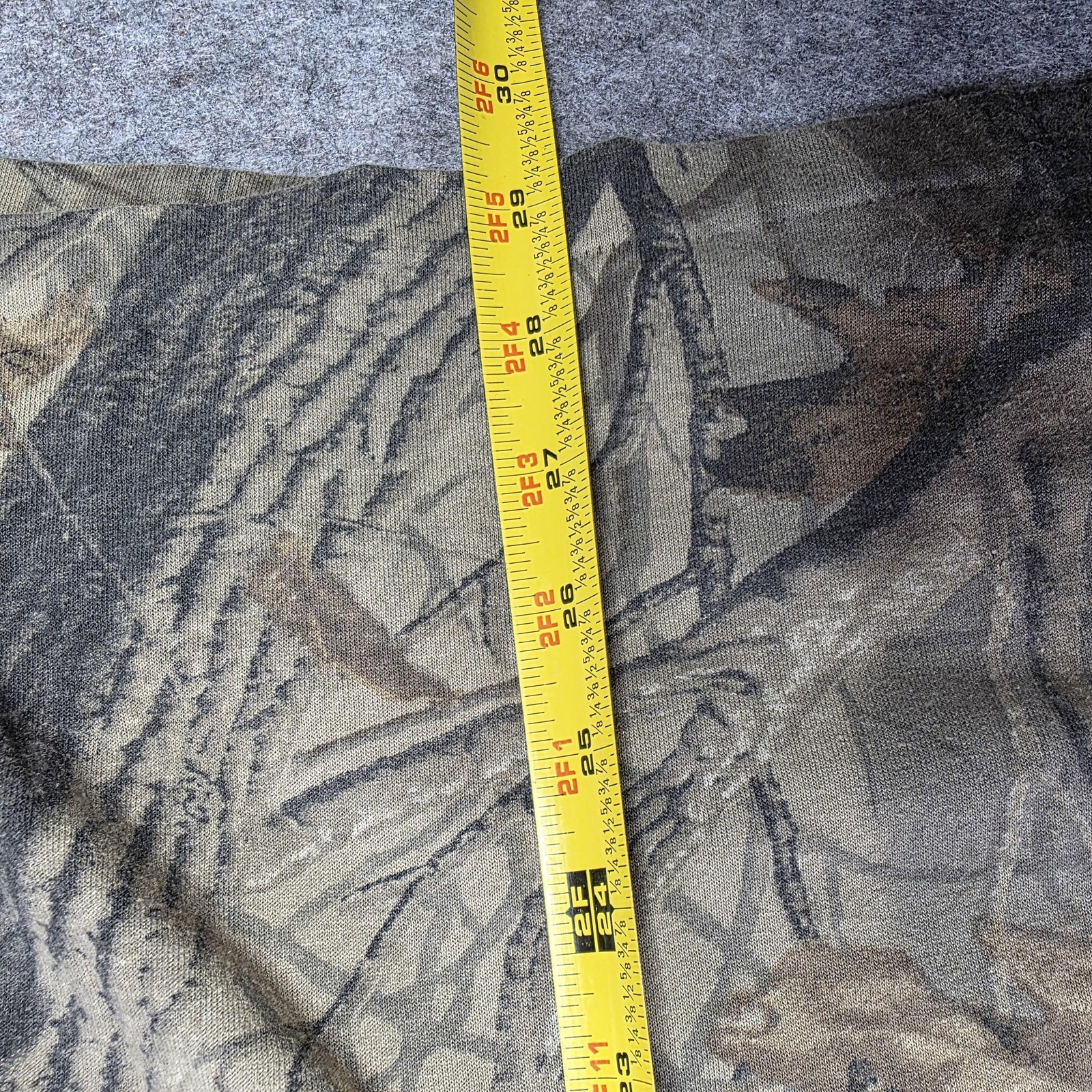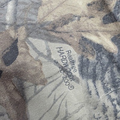 Style details: Realtree Hardwoods camo, long sleeve, ribbed brown collar/cuffs, classic 90s outdoor hunting style