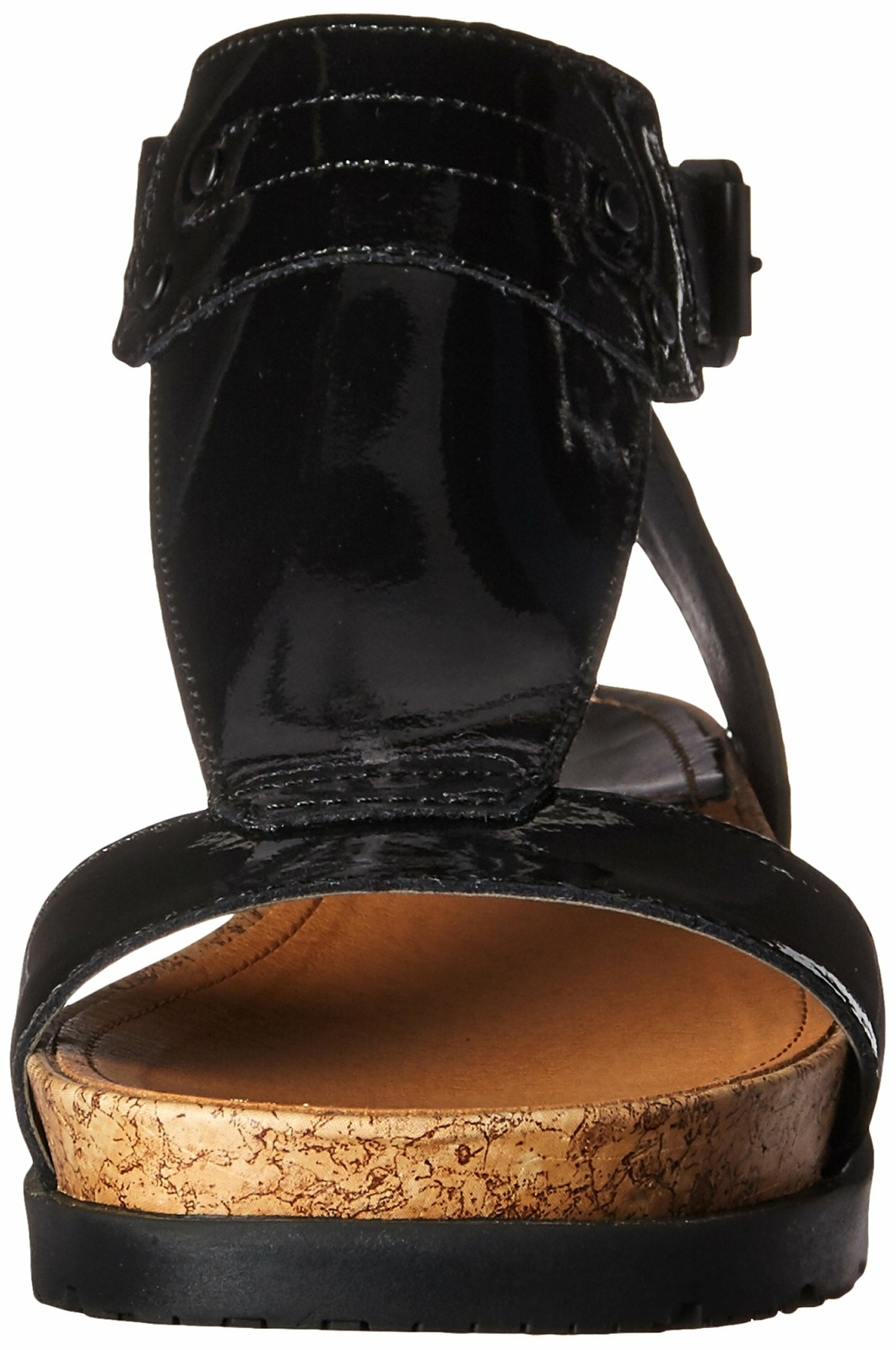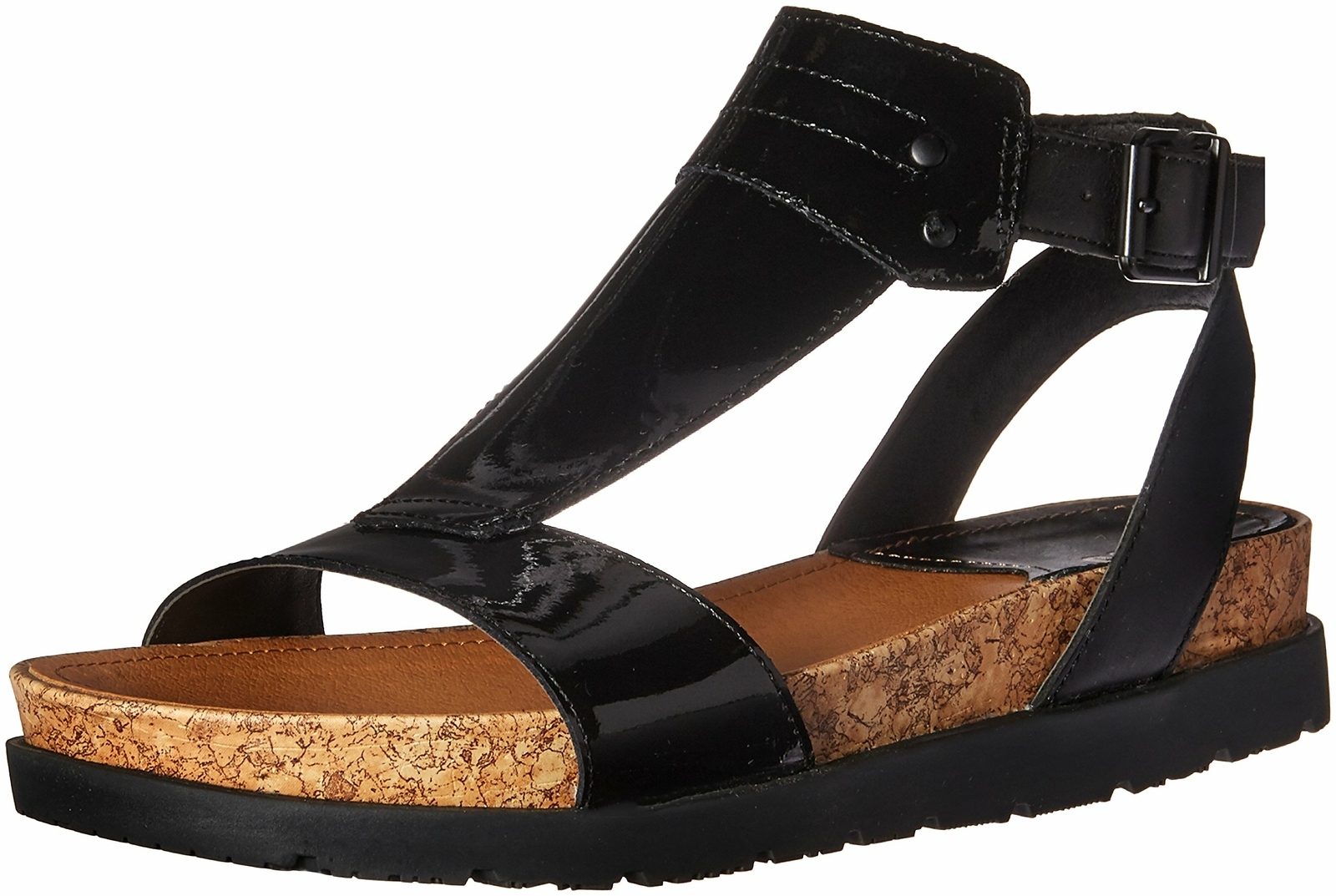 Leather t strap sandal with faux cork cushioned footbed and rugged rubber outsole.