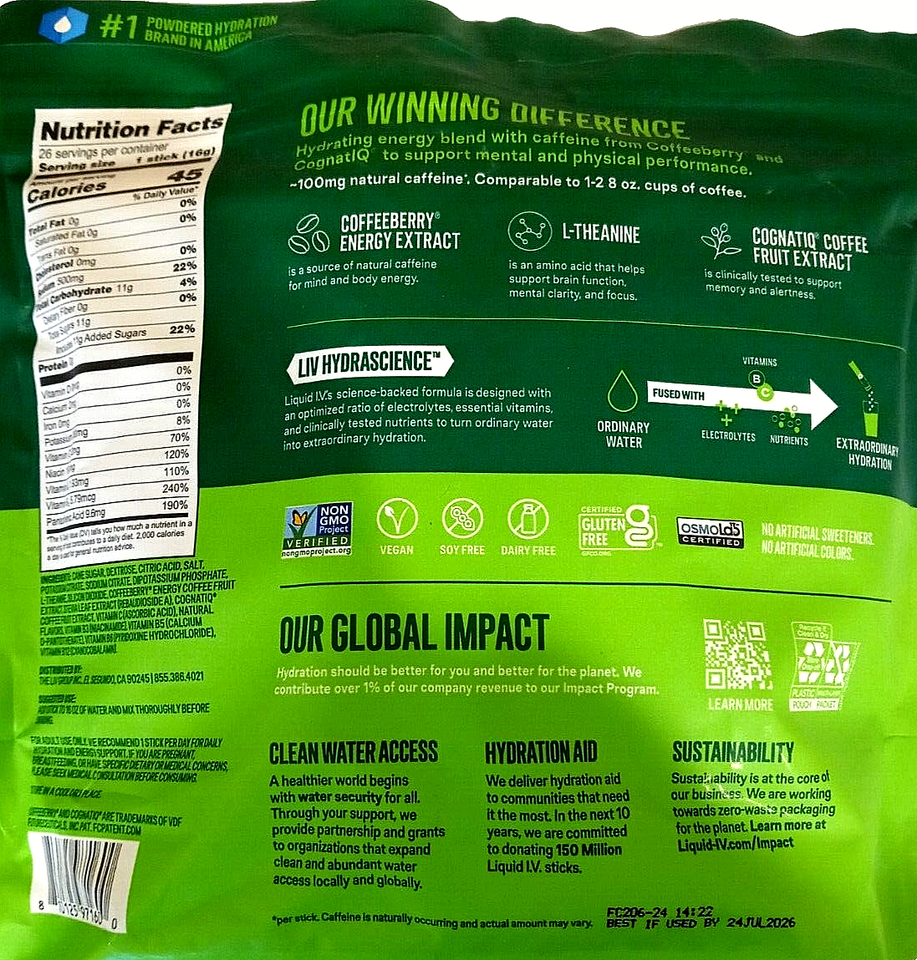 Liquid I.V. Hydration Multiplier+Energy Drink Mix BlackBerry Peach 26 Pack 07/26