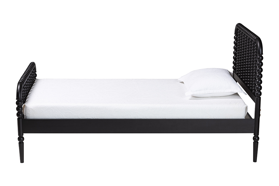 Features: Mid-Century Full Size Platform Bed Constructed from Rubberwood and Engineered Wood Turned bobbin design rich with traditional charm Slatted wood headboard and accent footboard Tapered legs provide excellent stability No Box Spring Required: Wood slats eliminate the need for a box spring Set Includes: One (1) Full Size Bed