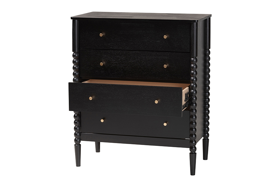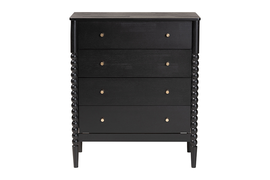 Features: Mid-Century Chest Constructed from Rubberwood and Engineered Wood Turned bobbin design rich with traditional charm Four (4) drawers provide ample space to organize clothes, linens, and more Minimalist metal drawer pulls add a glamorous touch Tapered legs provide excellent stability Set Includes: One (1) Chest
