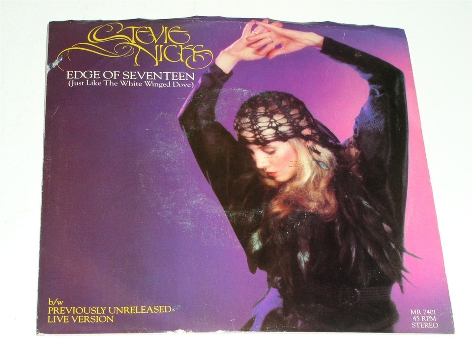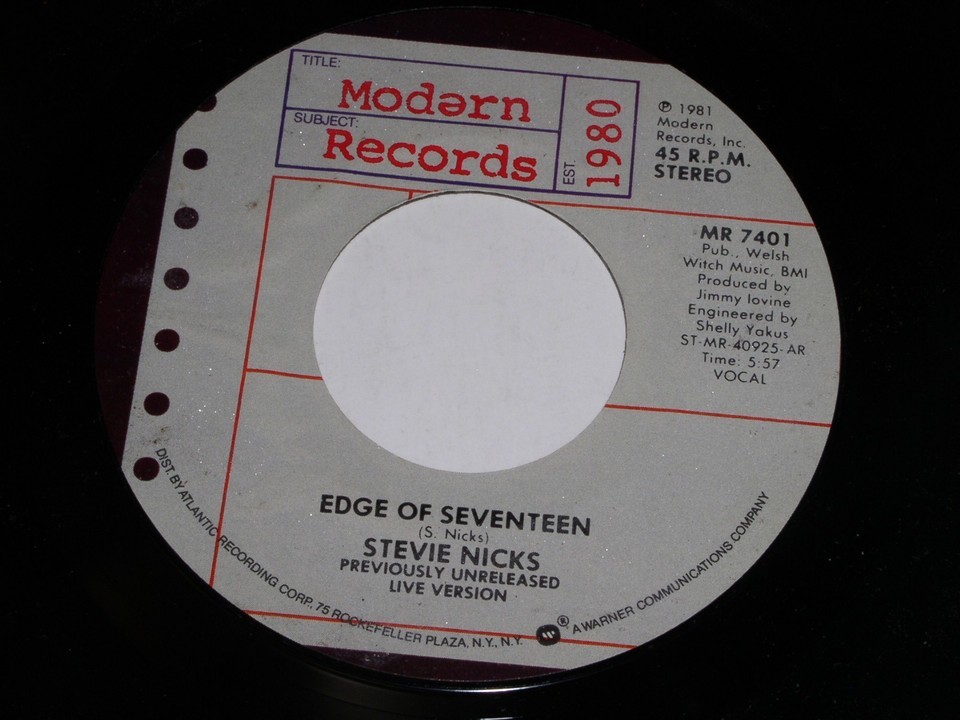 This is a vintage 45 rpm phonograph record by Stevie Nicks entitled, "Edge Of Seventeen". Flipside: "Live Version". Record label Modern MR 7401. Comes with its original picture sleeve as shown.