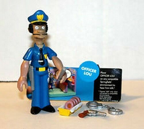 Simpsons Officer Lou World of Springfield Interactive Figure by Playmates comes new in original packaging and box. Welcome to Springfield, USA - The town that put the "fun" in dysfunctional! Whether enjoying the shotgun sociability of Moe's Tavern, A Creamed Cornsicle at the Springfield Retirement Castle, the gene-altering radiance of the Springfield Nuclear Power Plant, or the warm perspiration of a Kwik-E-Mart Heat-Lamp Dog,you'll always feel special in Springfield - the town America calls "Shabby"! So please visit us here in Springfield, where - compared to us - you're royalty!
