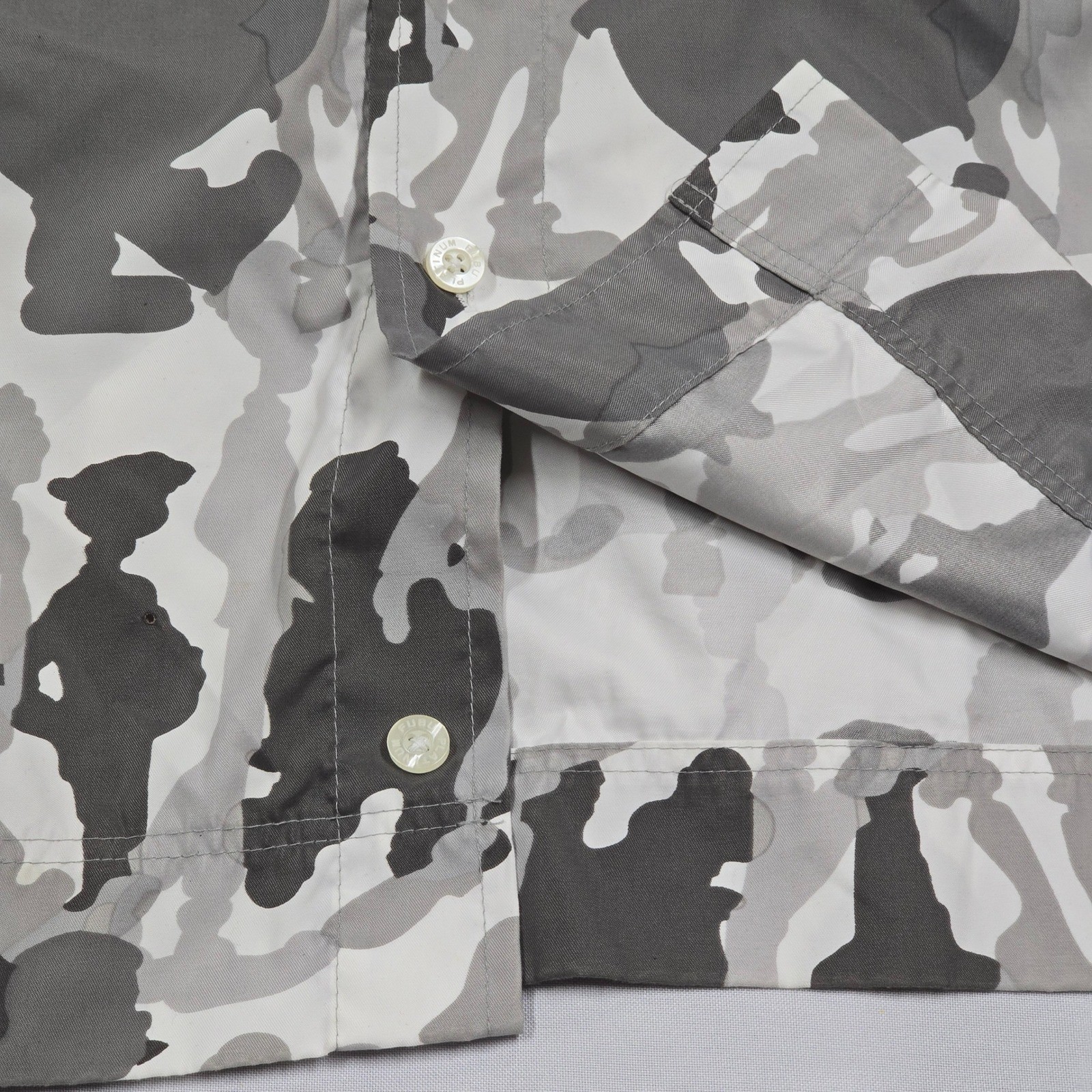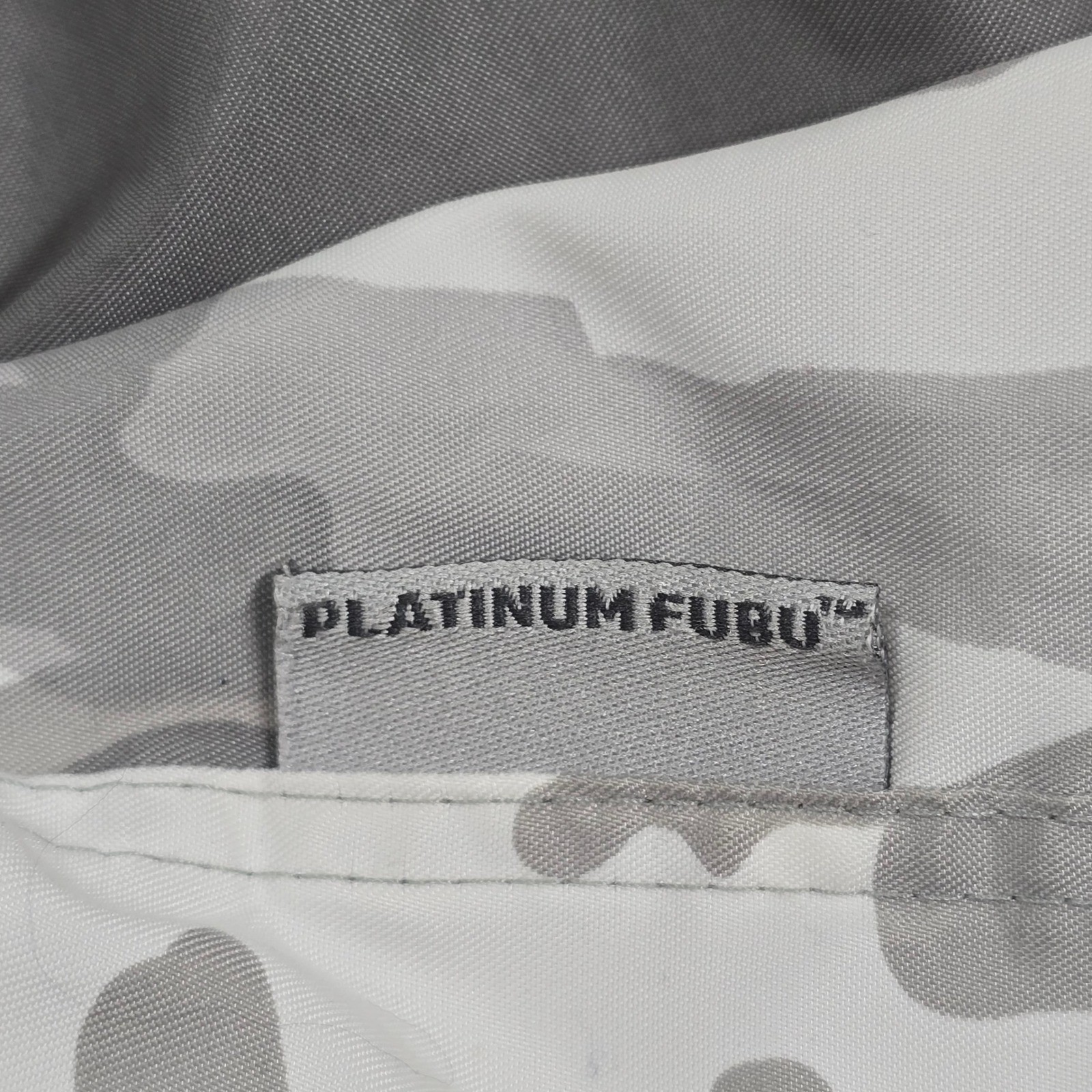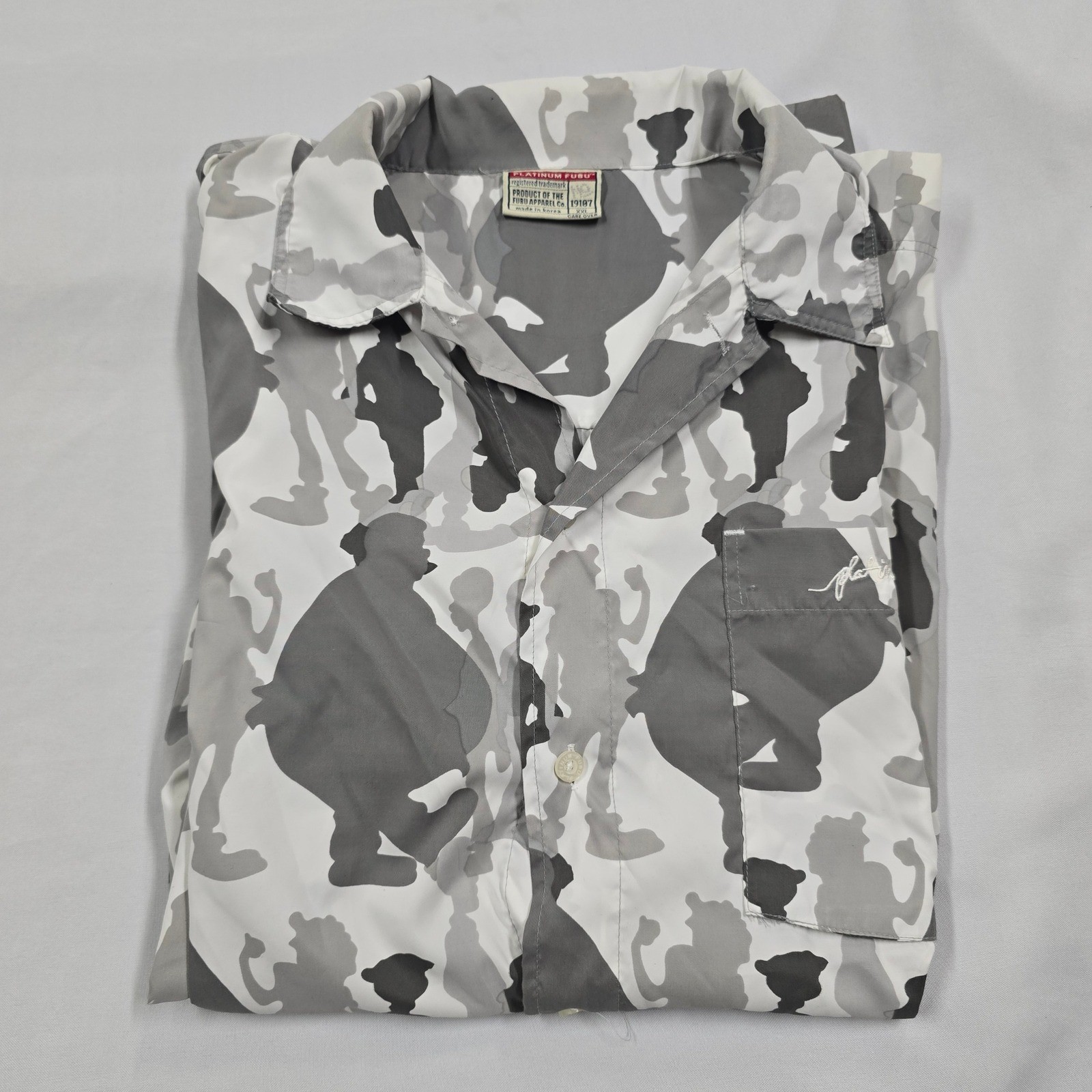 A Platinum Fubu Fat Albert camo button-up shirt, this piece offers a unique take on camouflage with its stylized silhouette pattern. The gray tones provide a modern, urban aesthetic, making it a versatile addition to any streetwear enthusiast's wardrobe. Details such as the chest pocket, subtle Platinum Fubu embroidery, and buttons enhance the shirt's quality.