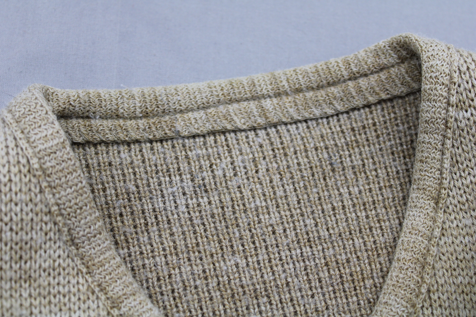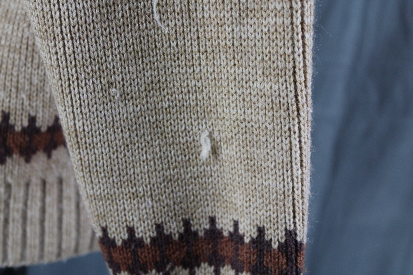 This sweater is in good condition. Please note that one of the buttons is missing, and there is a small snag on the left sleeve. Please see the images for your reference.