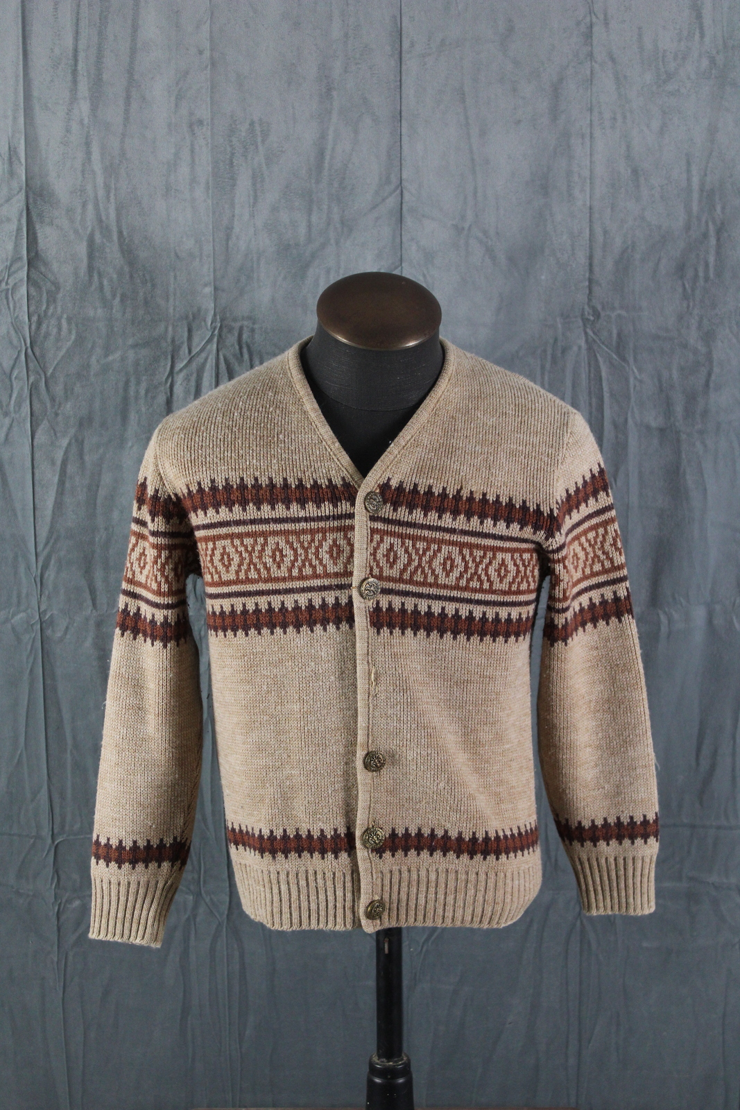 Up for sale is a vintage button-down sweater. It has a beige base colour with geometric patterns woven into the middle in brown shades. There are large buttons down the fornt. What a great sweater do not miss out on it.